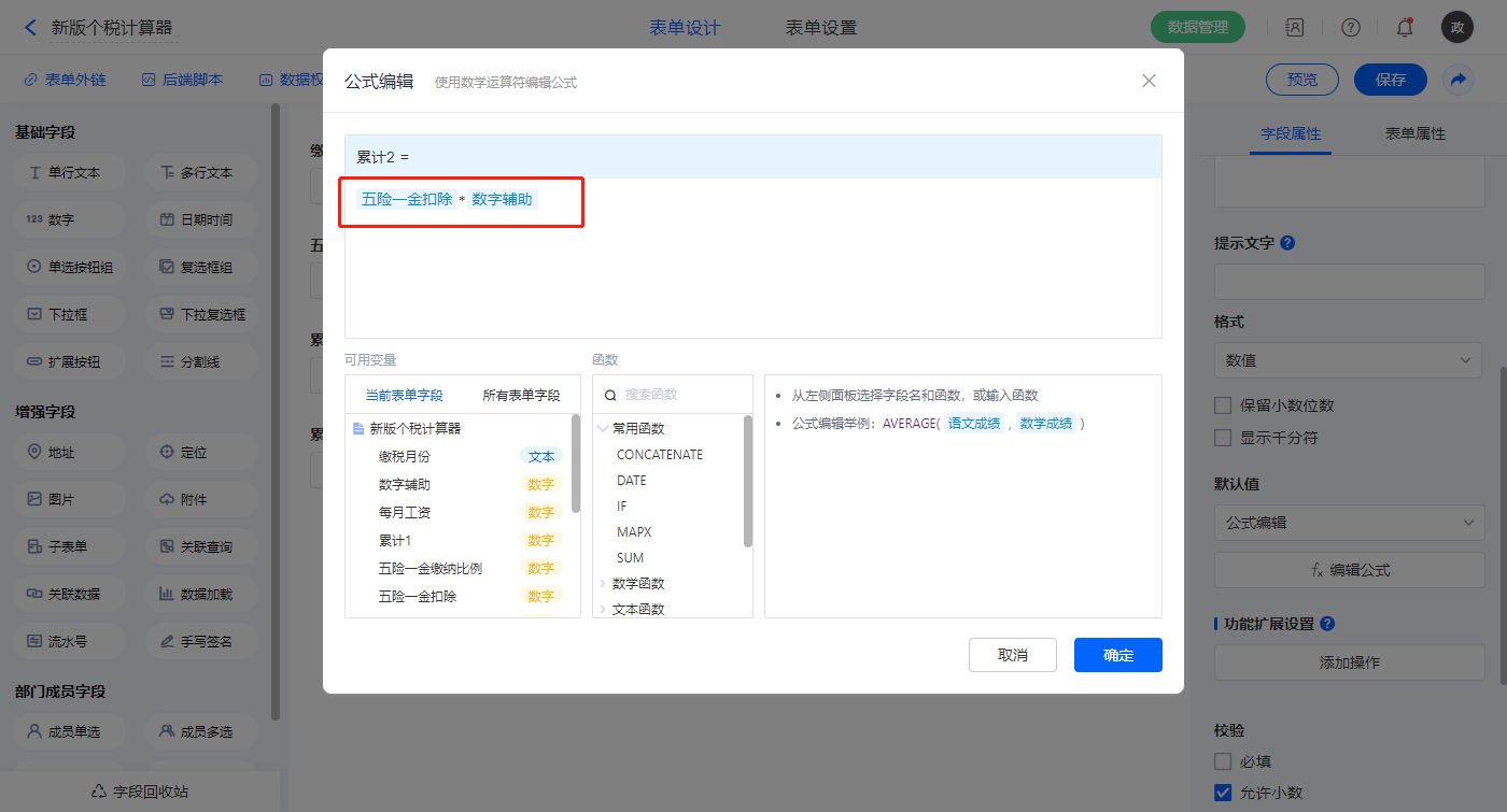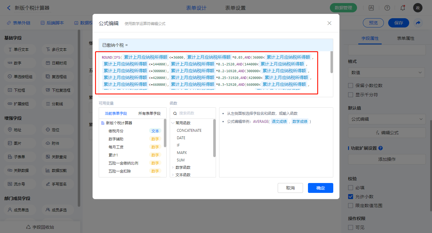 【本月需缴纳个税】字段,默认值选择公式编辑,如图设置公式;