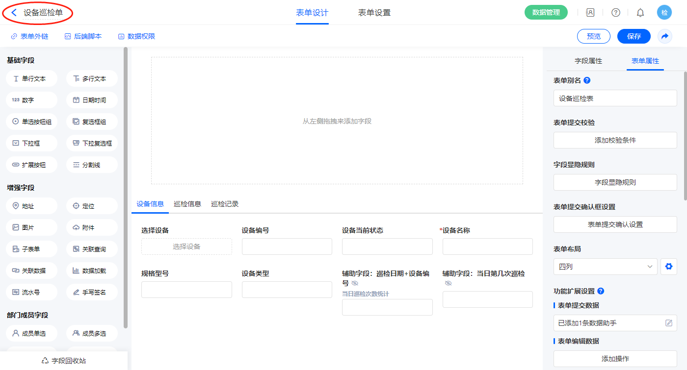 | 巡检时间计划 | 单行文本 | 巡检人员 | 成员单选 |