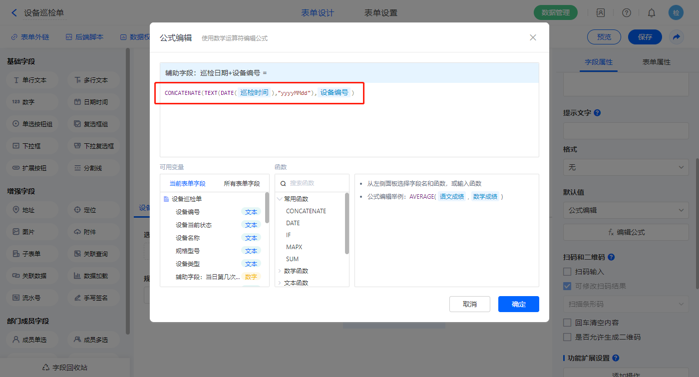 3)【辅助字段:巡检日期+设备编号】字段,默认值选择公式编辑,如图设置公式;