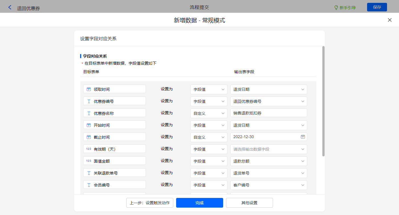 其他设置触发条件为【金额退回方式】等于优惠券,设置好点击【完成】并保存该数据助手;