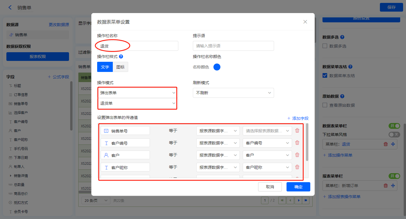 【退货】的菜单栏,操作模式设置为弹出表单【退货单】;
