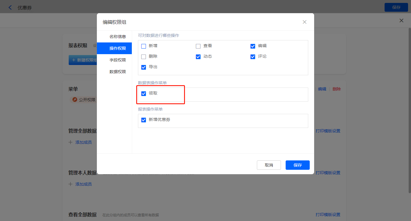 【领取】的菜单栏,操作模式设置为弹出表单【领取优惠券】;