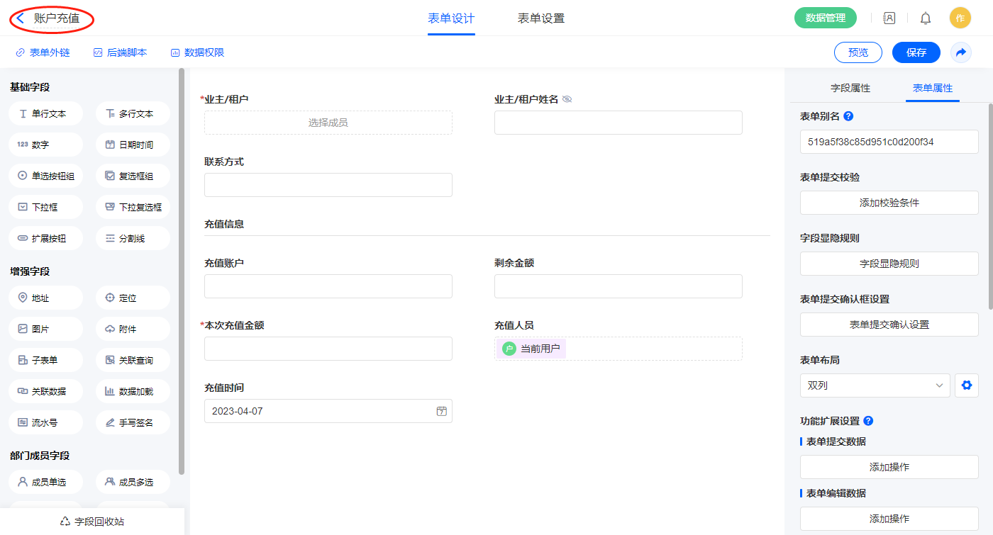 【账户充值】的菜单栏,操作模式设置为弹出表单【账户充值】;