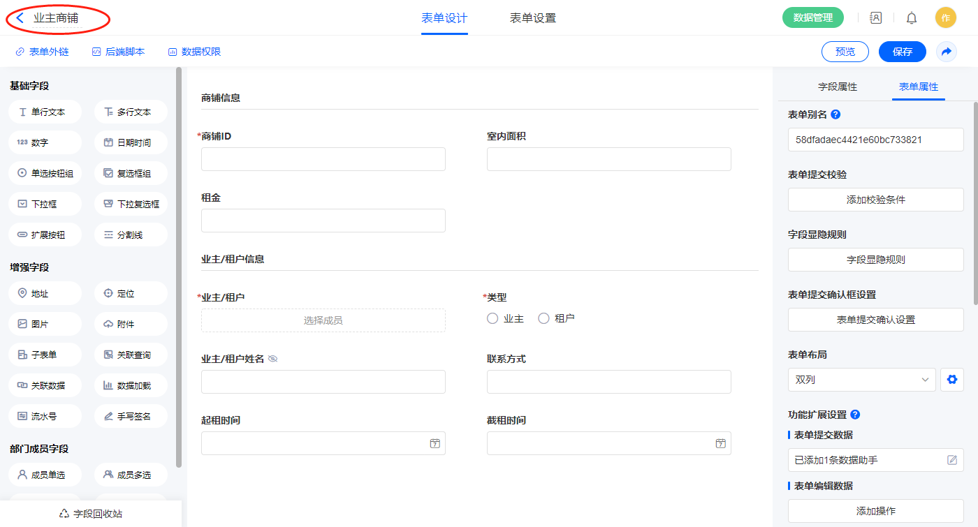| 商铺号 | 单行文本 | 业主/租方姓名 | 单行文本 |