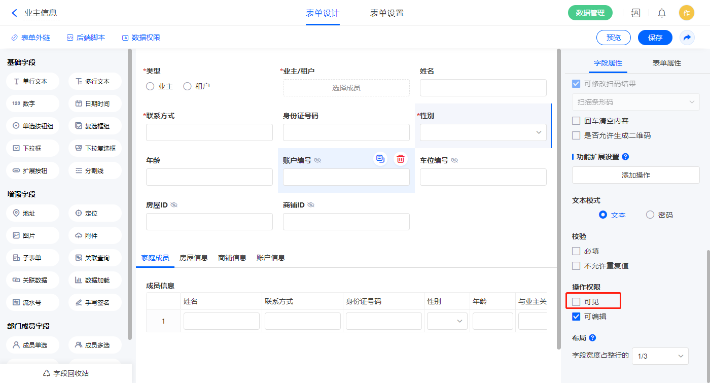 1)选中【账户编号】、【车位编号】、【房屋ID】、【商铺ID】字段,设置不可见;