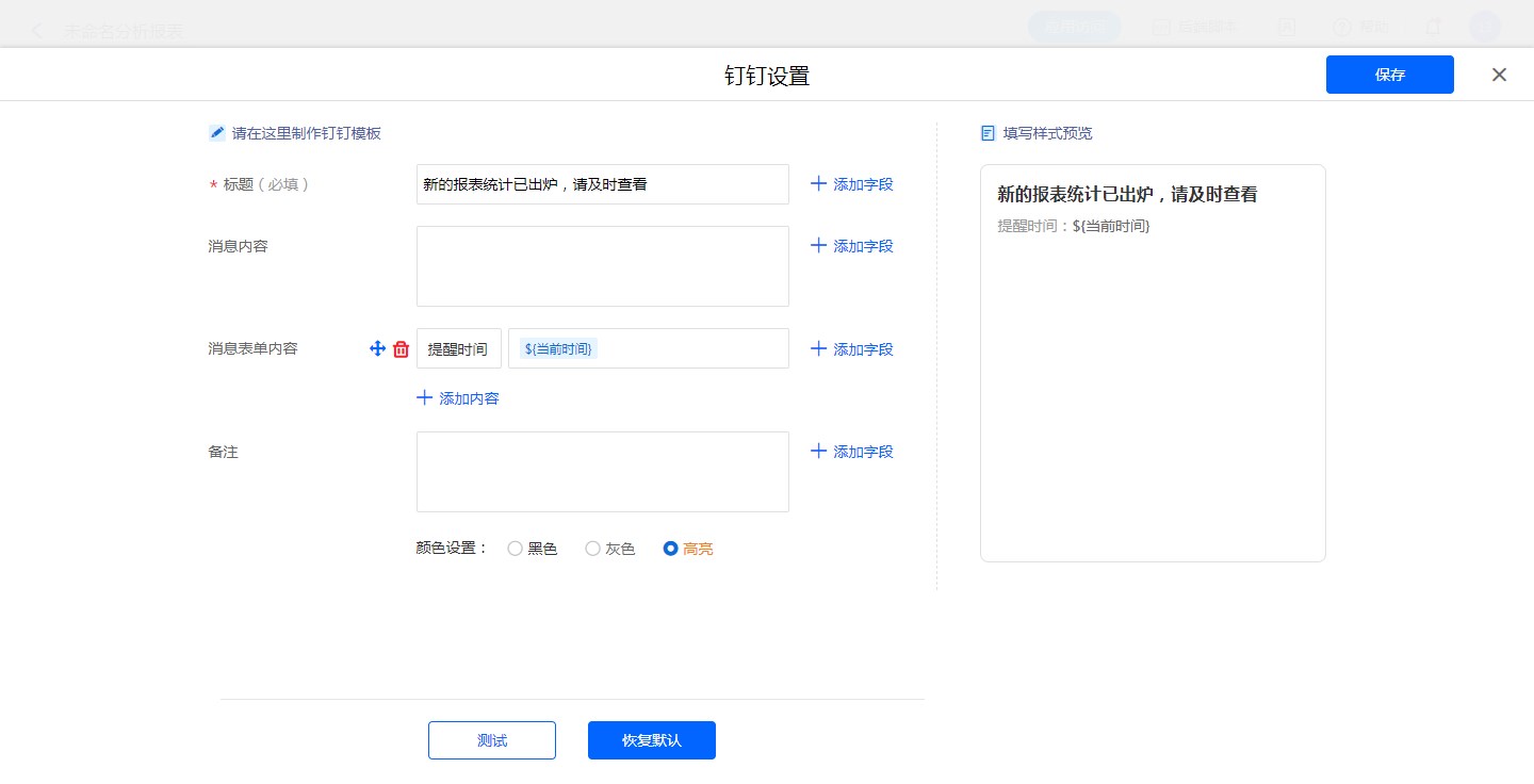 - 标题:必填,支持自定义文字,以及添加[当前时间]字段。
