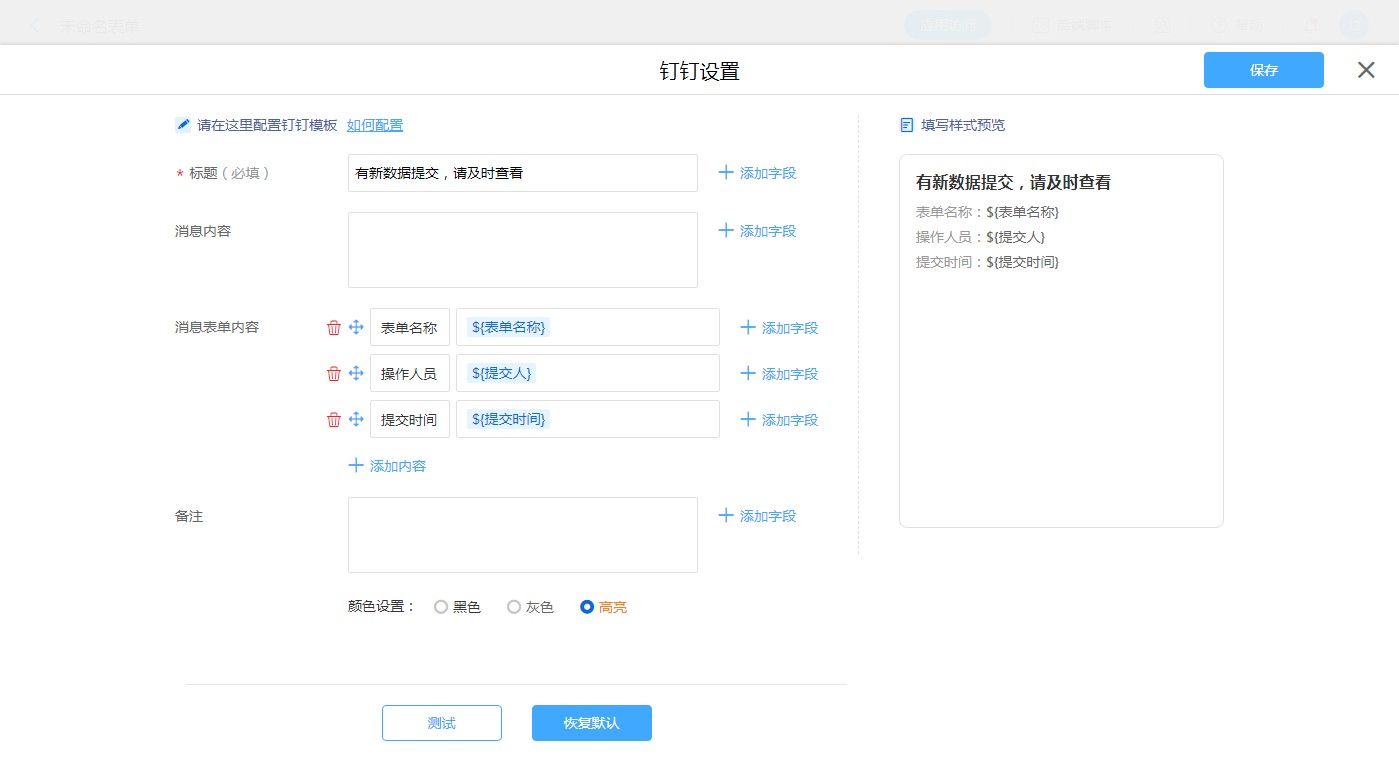 【普通表单设计】-【表单设置】-【消息推送】-【新建消息推送】-【钉钉提醒,钉钉设置】