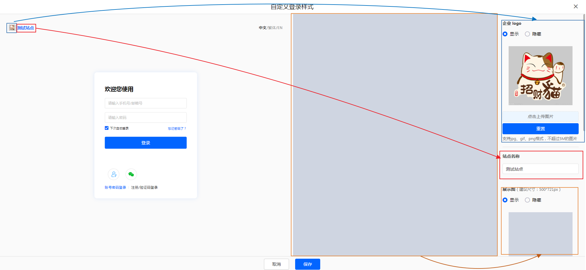 - 自定义登录页的配置,通过企业URL打开登录页生效;站点登录页的自定义样式需要私有云后台配置。
