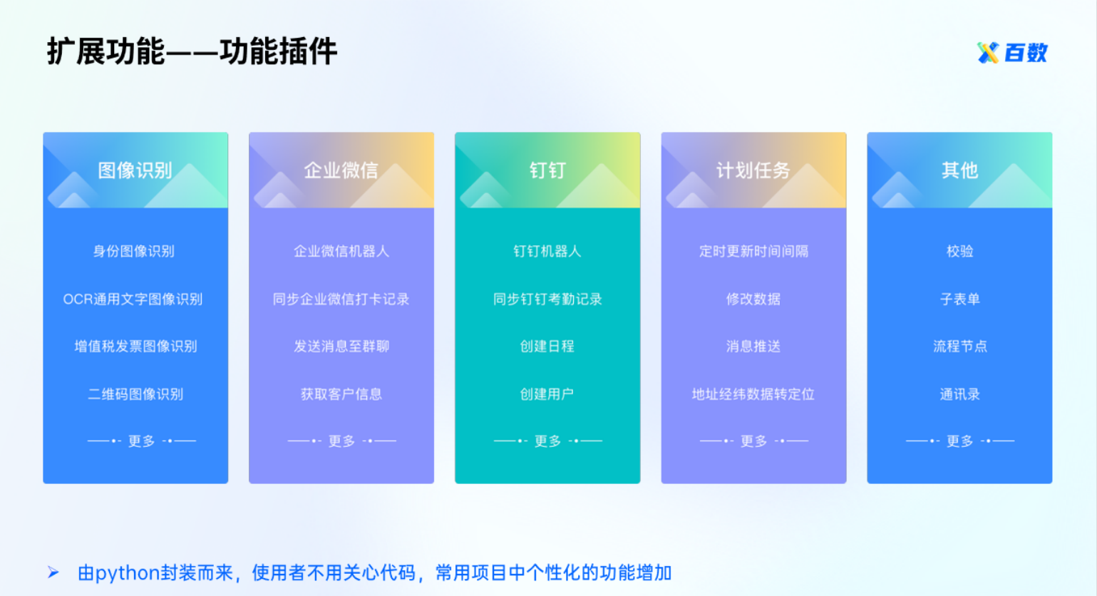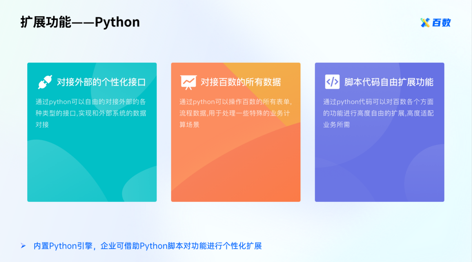 - Python:数转平台已覆盖目前市面上低代码产品的大多数功能,当用户对产品有特殊需求时可使用Python来实现。