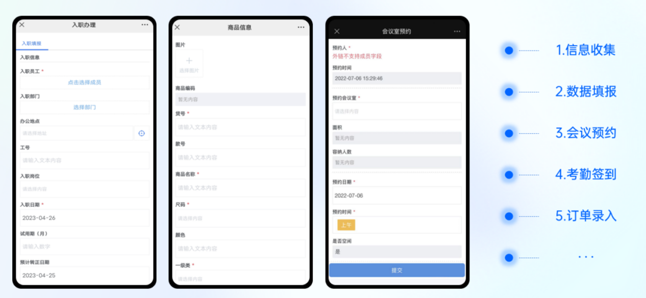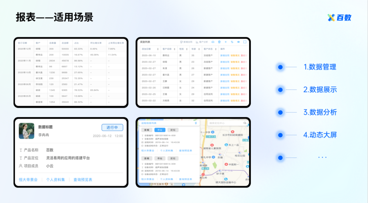 通过数转平台可以迅速搭建简单实用的CRM管理系统、进销存、生产管理、人事管理系统、财务系统,或者是调查问卷、报名登记申请等等应用场景。