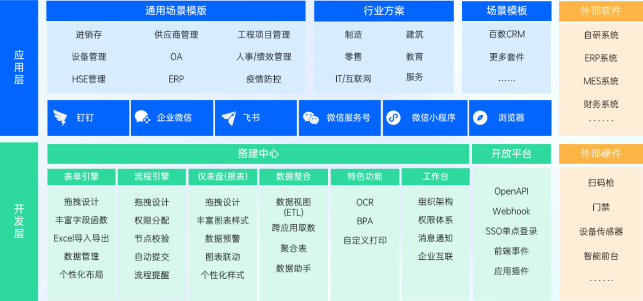 数转平台是一款一站式企业协同低代码平台,深耕办公领域10年,为企业信息化发展提供系统化、流程化、智能化的解决方案。 数转平台的字段控件、功能插件以及标准应用,帮助使用者无需代码基础也可搭建出个性化管理应用,轻松构建出随需而变的业务管理应用。例如:生产管理、进销存、仓库等。 数转平台与企业微信、阿里云、腾讯云、华为云达成深度合作是企业微信、阿里云、腾讯云、华为云官方认证的生态合作伙伴。