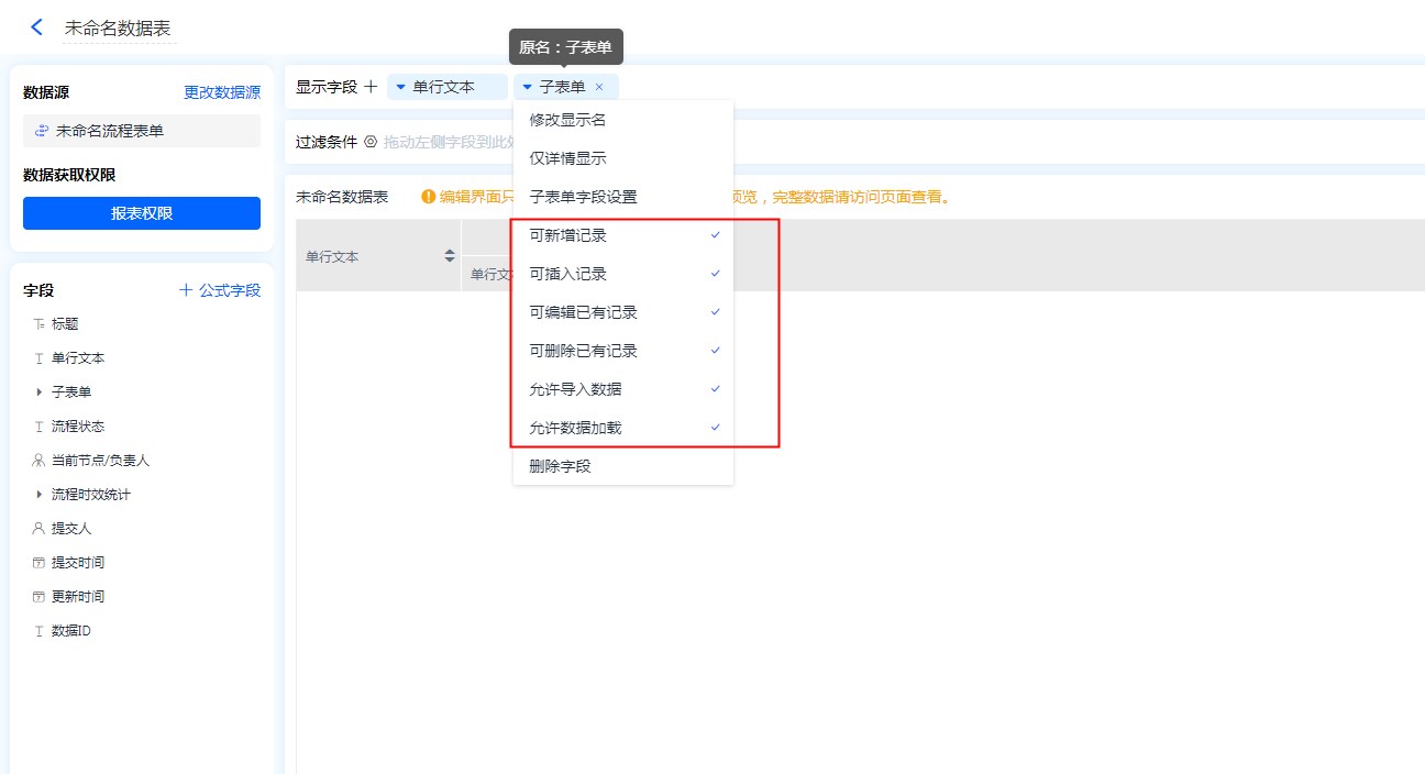 - 数据表、日历、卡片、地图场景报表中,显示字段下可以设置子表单操作权限;