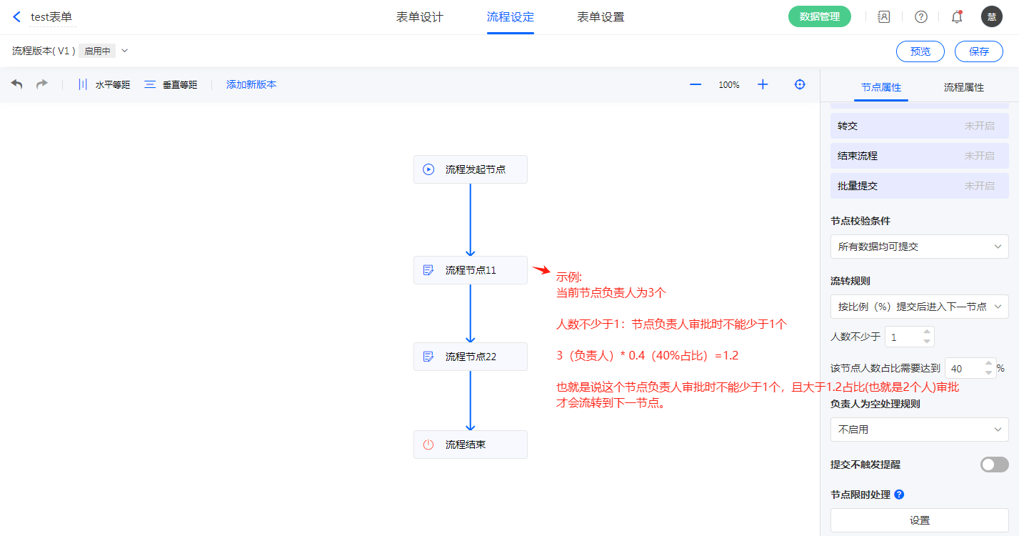 节点选择按比例后,会同时校验 人数 和 人数比例,当两则满足,进入下一个节点,不满足会停留在当前节点,等待下一个人审批。当审批的真实人数少于设置的人数时,流转失败,失败原因写入流程日志。