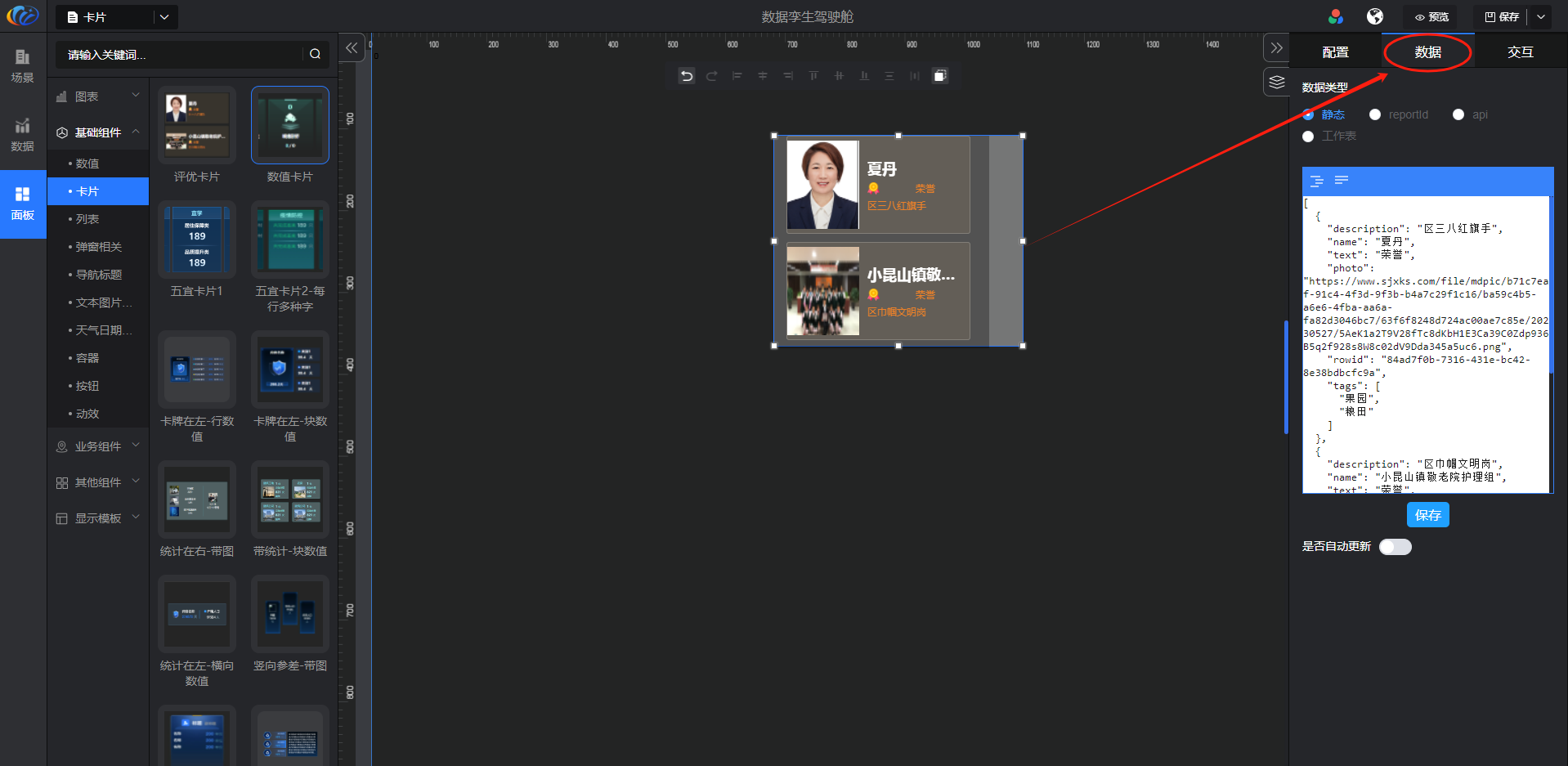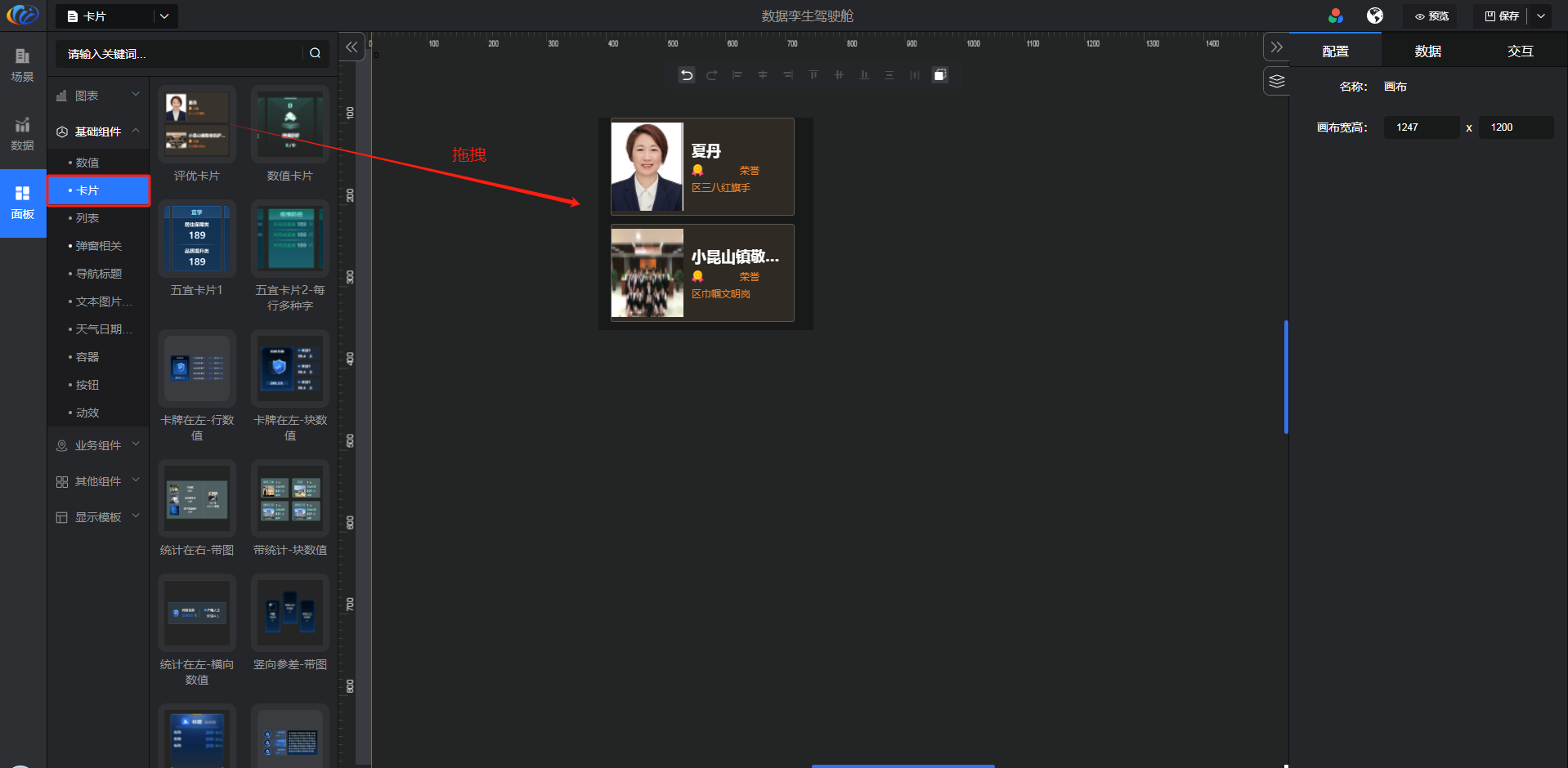 进入面板,展开【基础组件】点击「卡片」右侧显示数值的所有组件,可对其拖拽至黑色画布进行配置。