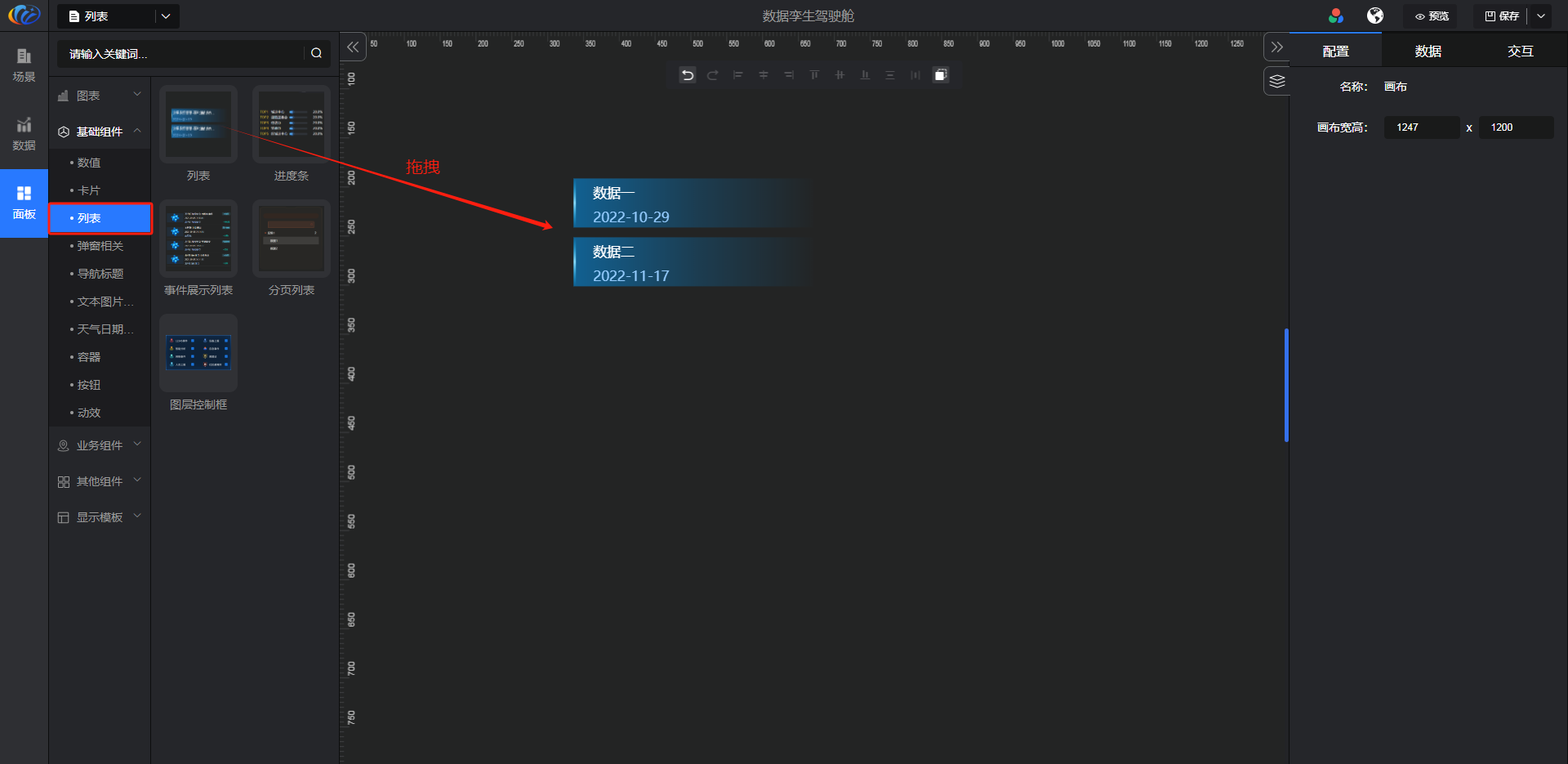 进入面板,展开【基础组件】点击「列表」右侧显示数值的所有组件,可对其拖拽至黑色画布进行配置。