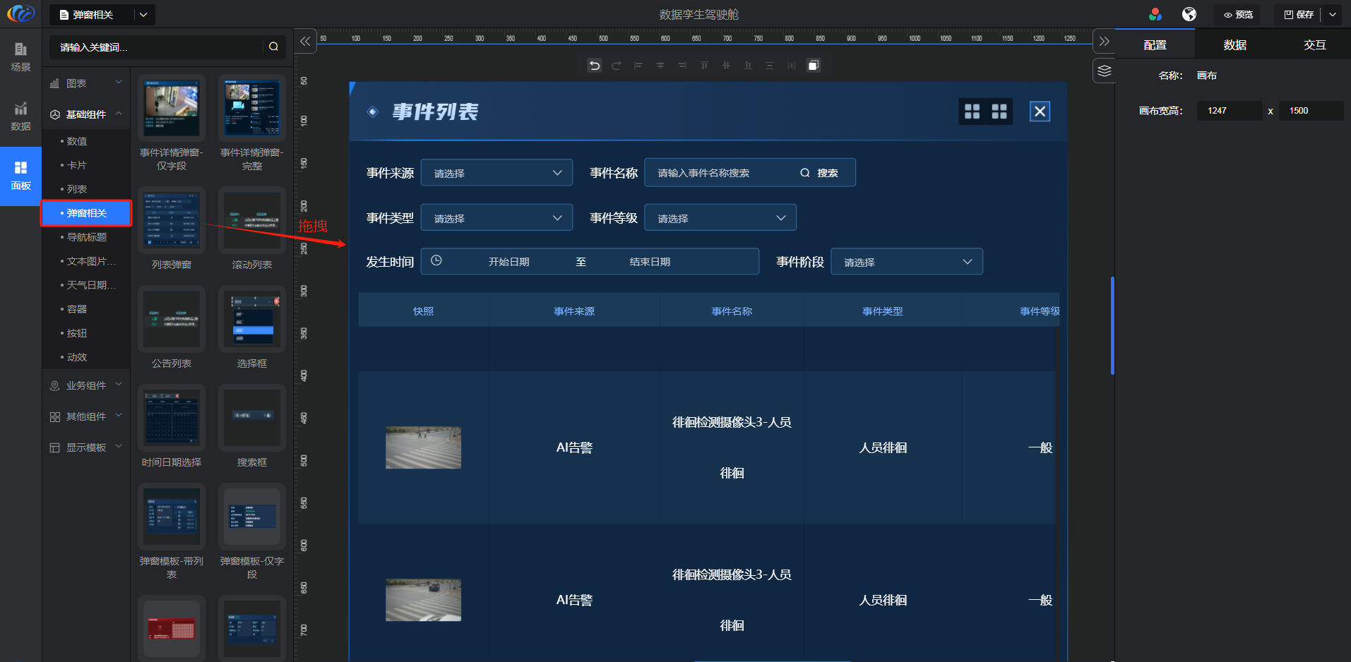 进入面板,展开【基础组件】点击「弹窗相关」右侧显示数值的所有组件,可对其拖拽至黑色画布进行配置。
