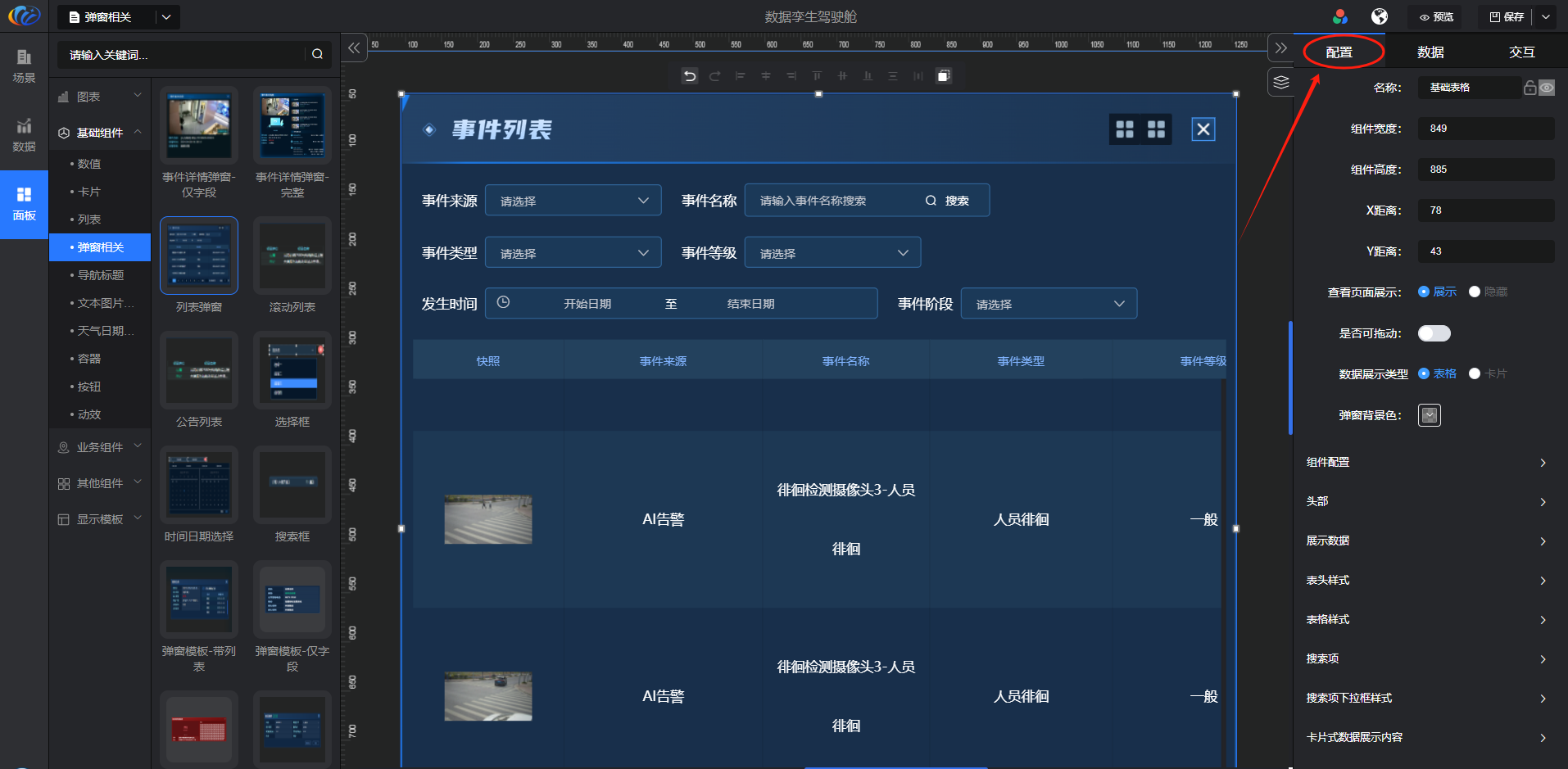 配置:可对组件的名称、宽度、高度、距离、展示样式等进行调整,画布同步显示配置效果。