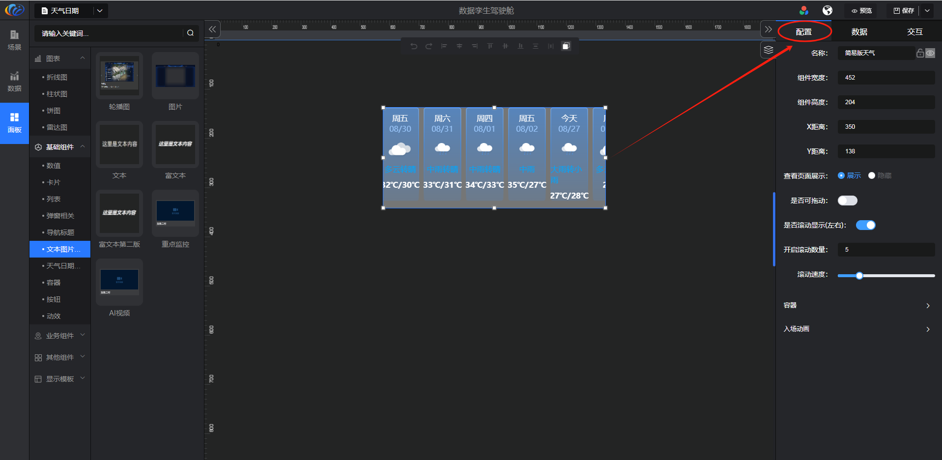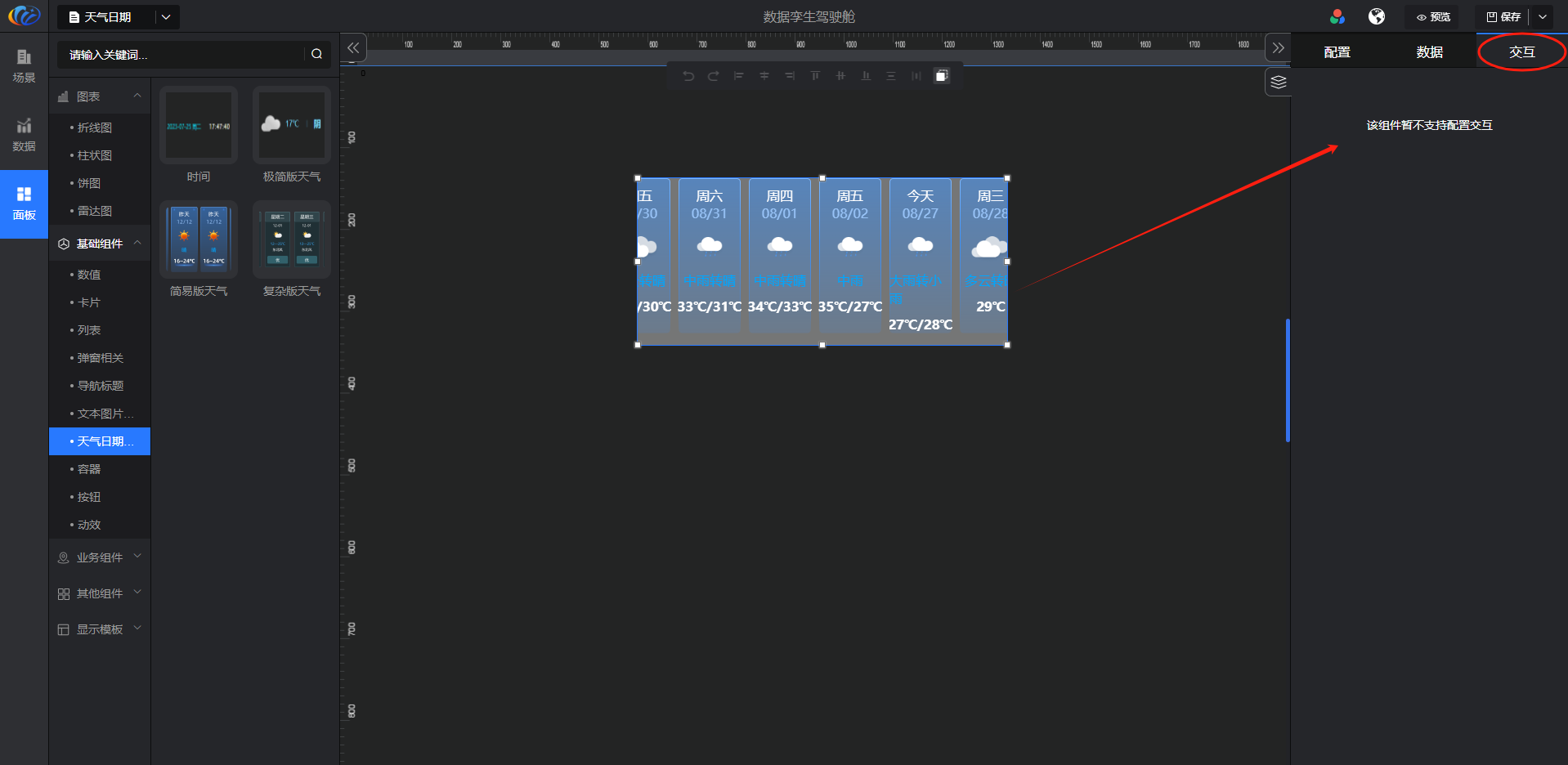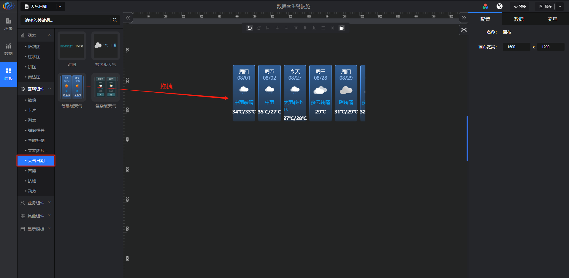进入面板,展开【基础组件】点击「天气日期」右侧显示数值的所有组件,可对其拖拽至黑色画布进行配置。