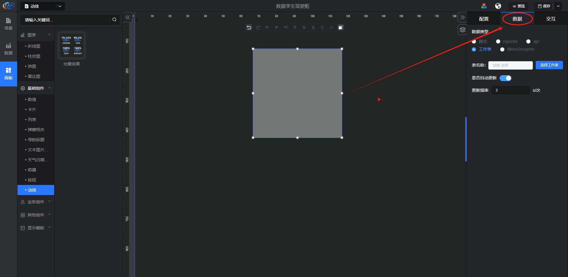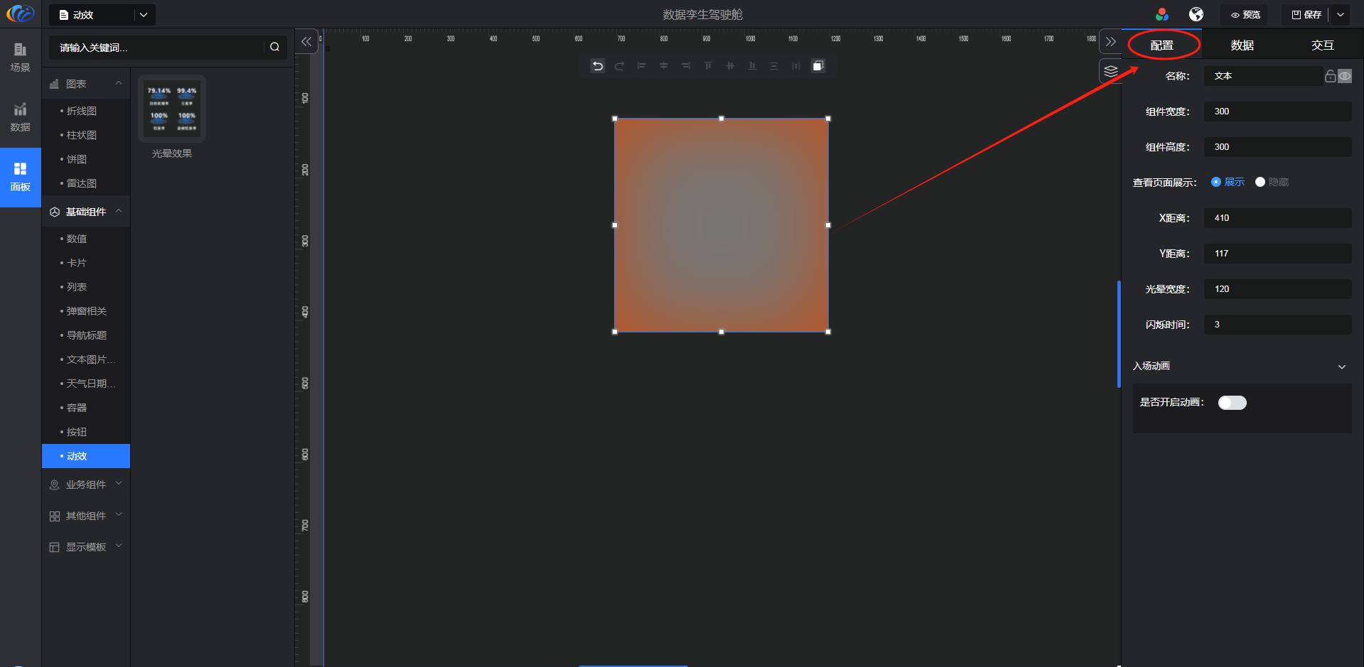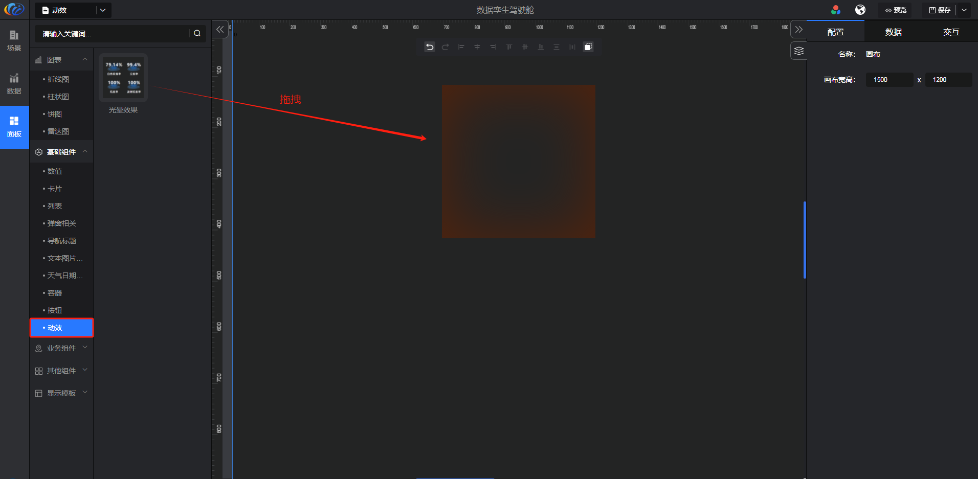 进入面板,展开【基础组件】点击「动效」右侧显示数值的所有组件,可对其拖拽至黑色画布进行配置。