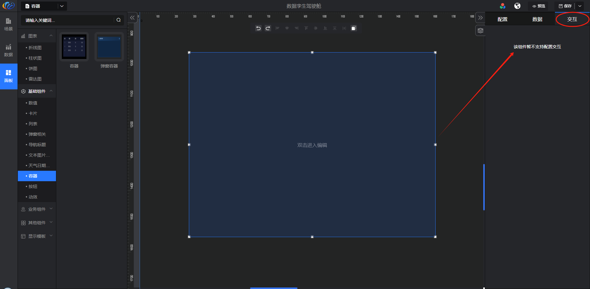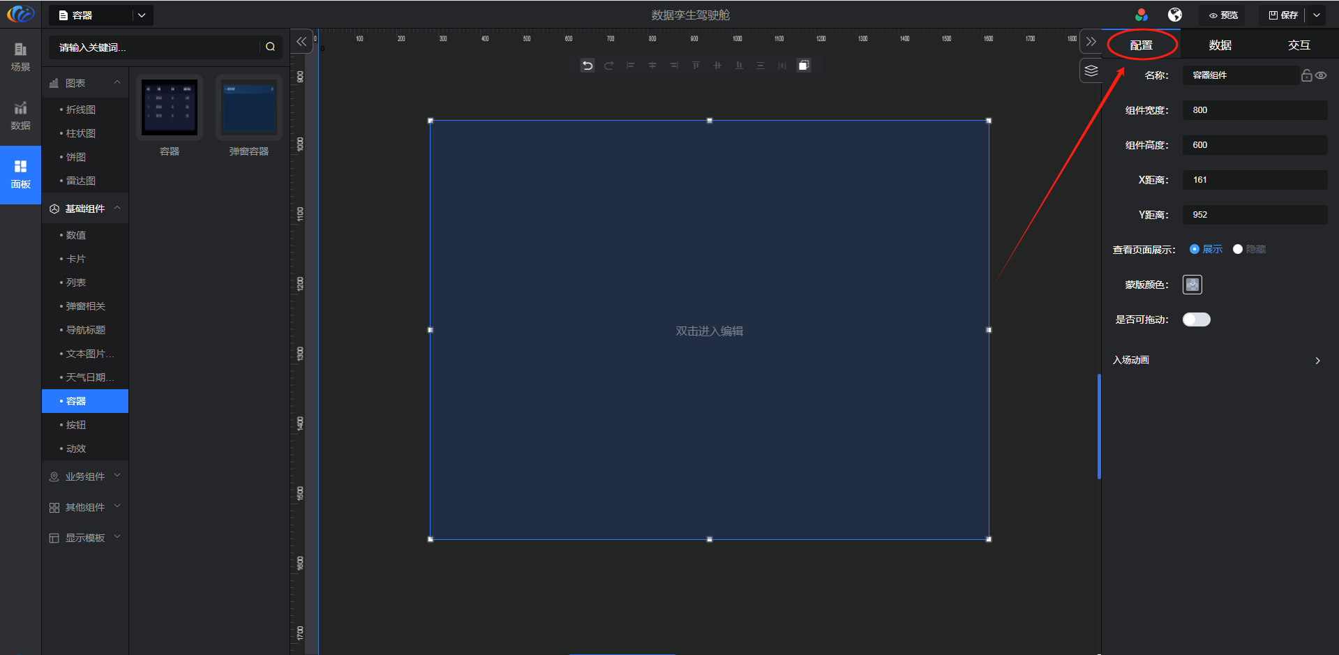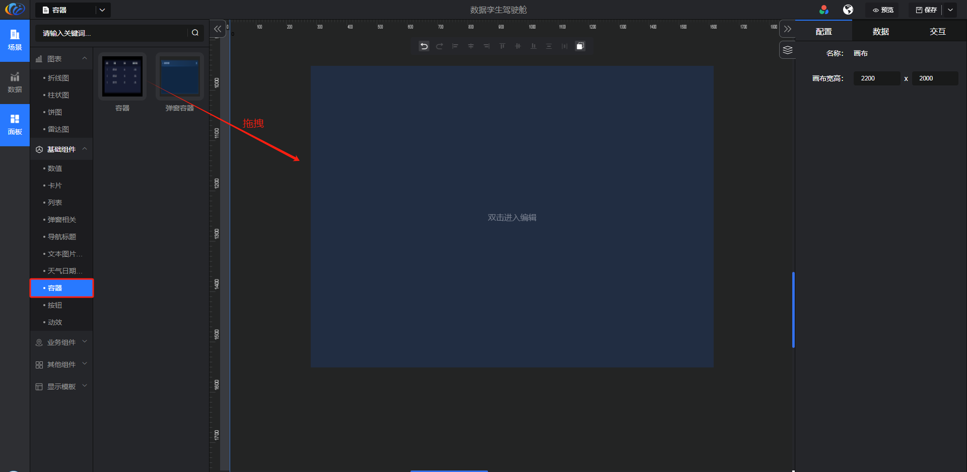 进入面板,展开【基础组件】点击「容器」右侧显示数值的所有组件,可对其拖拽至黑色画布进行配置。