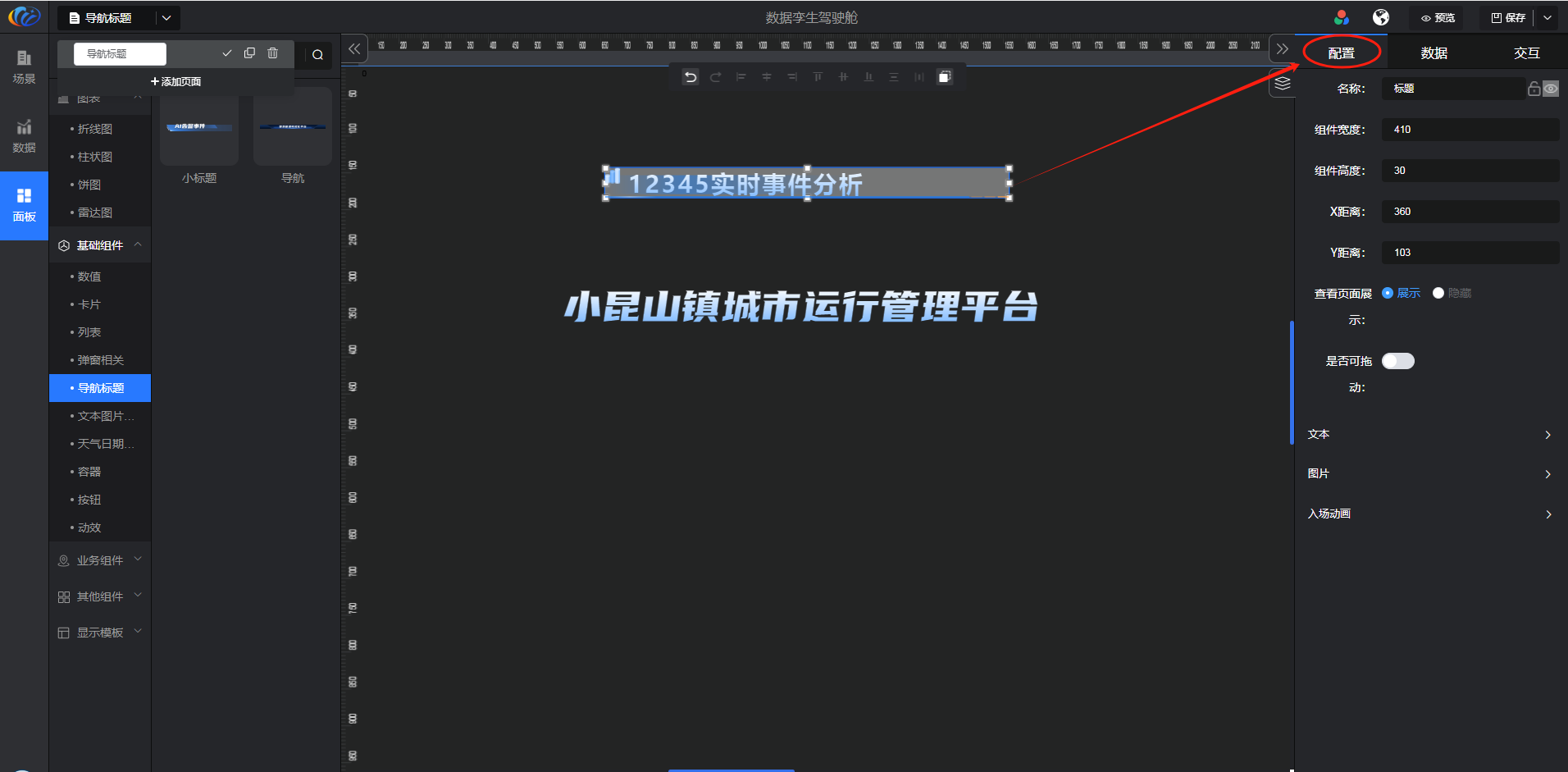 进入面板,展开【基础组件】点击「导航标题」右侧显示数值的所有组件,可对其拖拽至黑色画布进行配置。