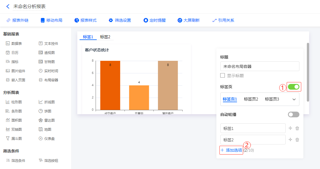 在布局容器组件的编辑界面可以开启标签页,开启后可添加多个标签,每个标签页中均可放置多个图表,相当于多个布局容器的组合。如下图所示: