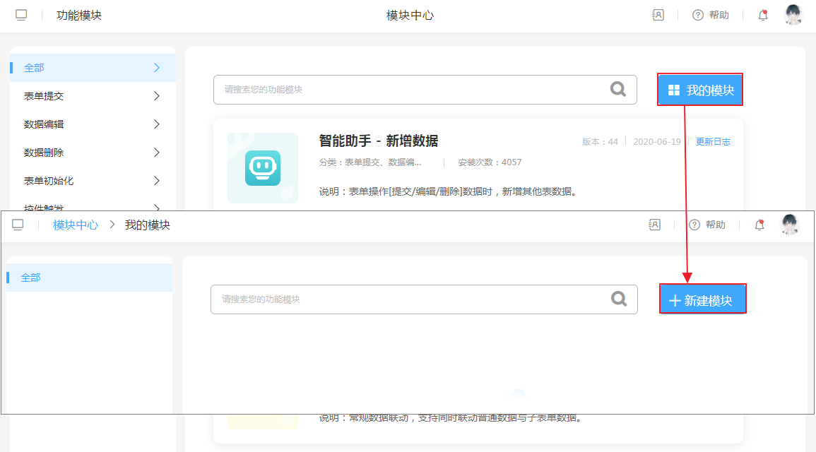 | 新建插件我们可以自行进行插件设计并编辑代码,设计完成后我们可以保存该功能插件也可发布到插件中心 |