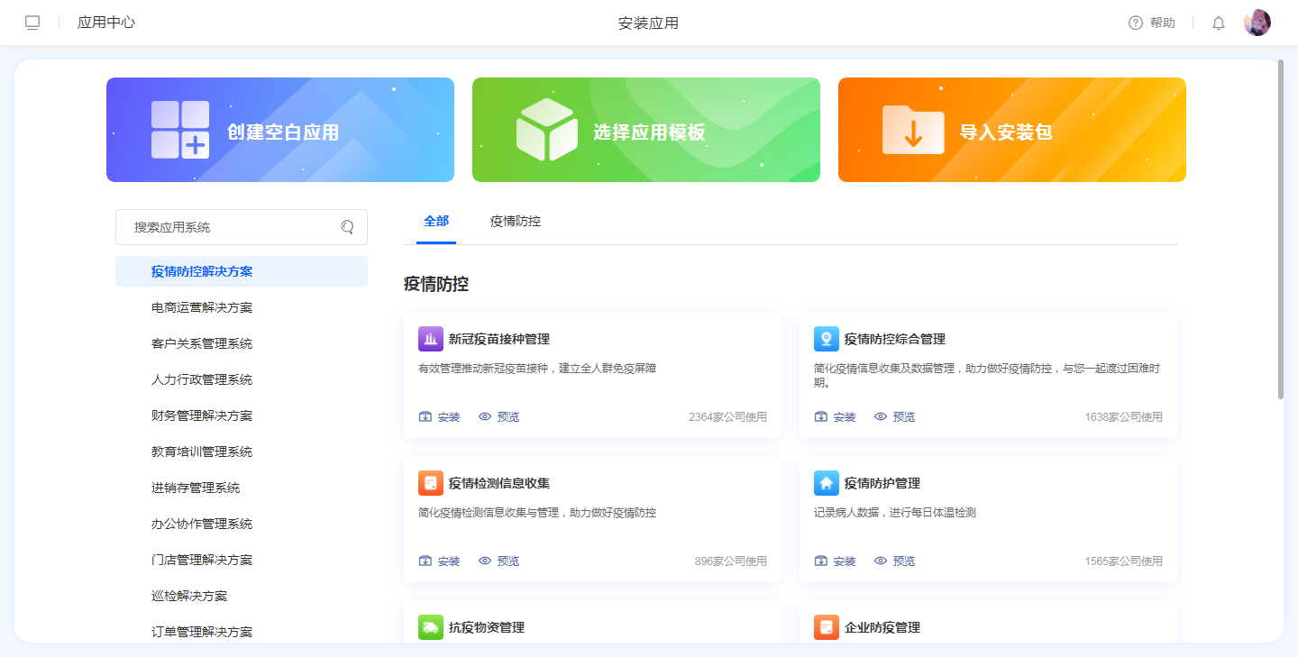 数转平台应用中心有近50的标准应用,全部安装即可投入使用,同时还有近120个各行各业的模板应用供用户参考,可自行修改。