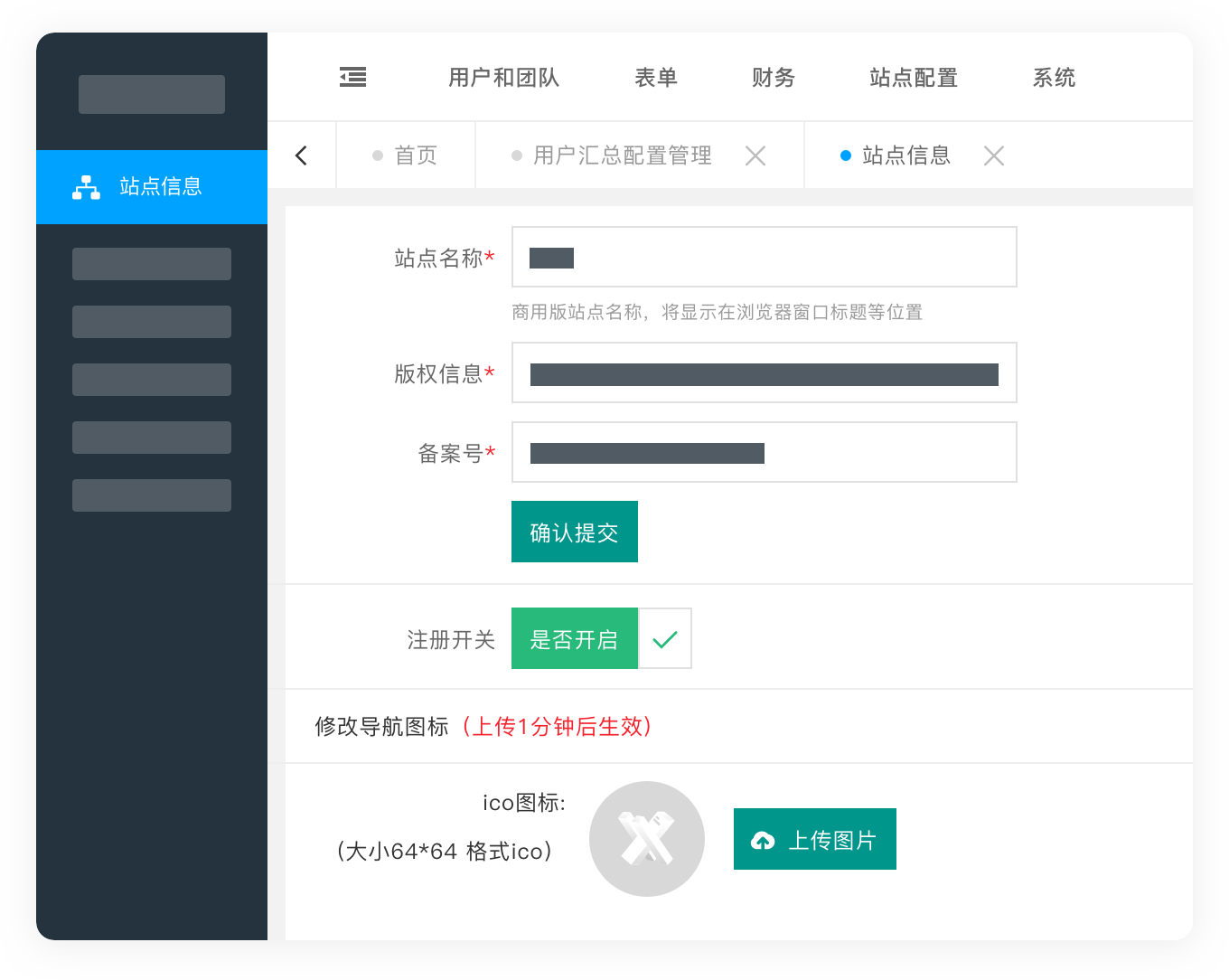 站点名称,logo及备案等信息的管理,站点性能配置,站点监控,操作日志,更新日志等均可按照自己的需要进行自定义设置
