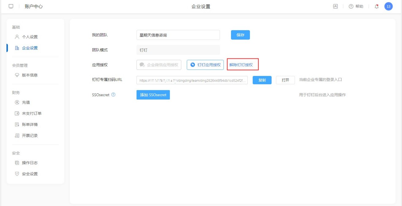 登录系统,在【账号中心】-【企业设置】,进行解绑操作。