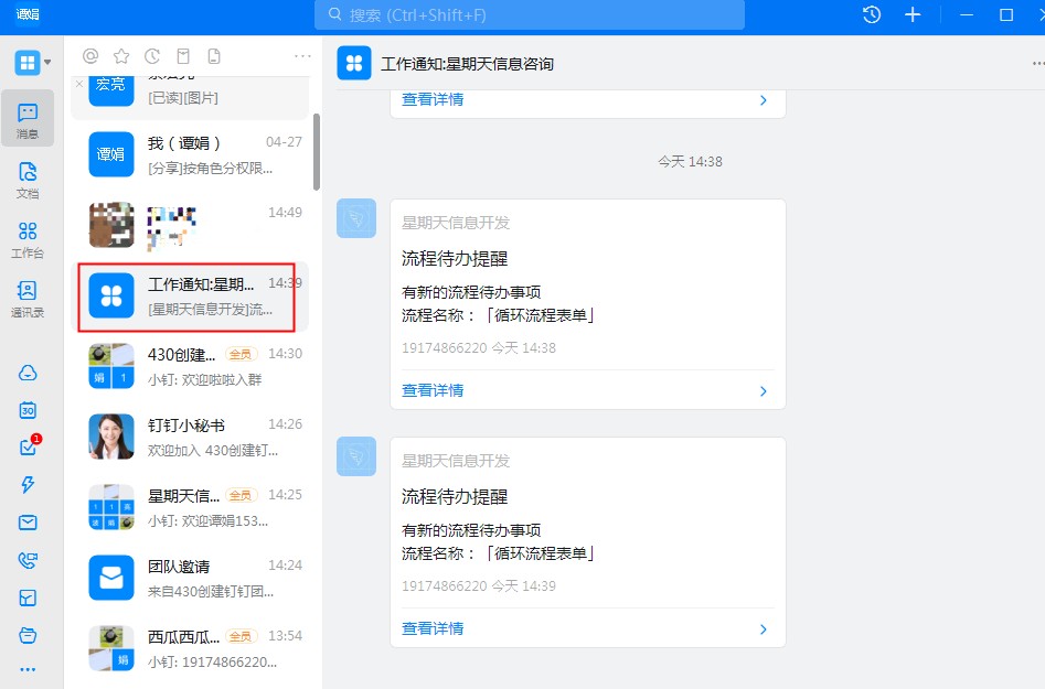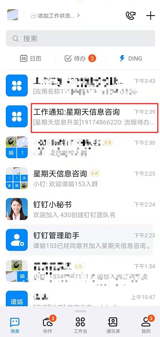 - 在消息列表-工作通知中,收到推送消息,点击消息可以进行处理。