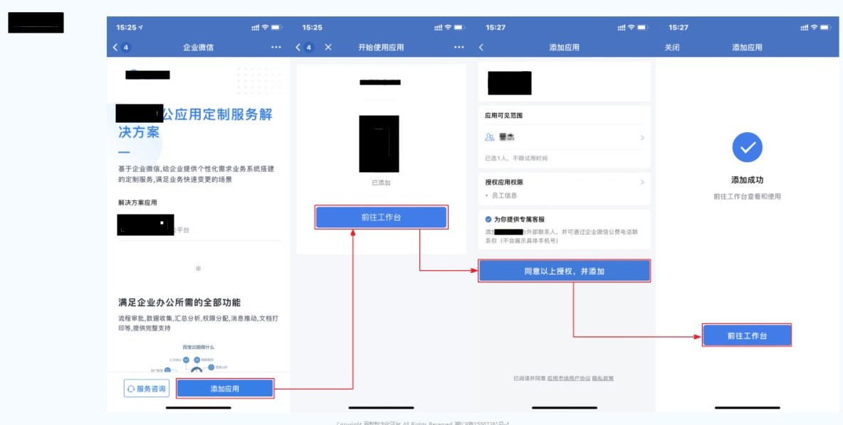 步骤:【添加应用】——【添加到我的企业】——【设置可见范围,勾选通讯录中可见该应用的成员】——【确定】——【同意以上授权,并添加】,授权成功后,会直接返回工作台。