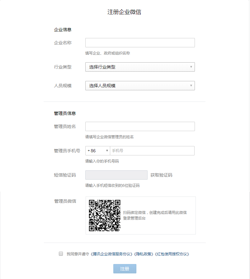 输入企业信息、管理员信息并同意企业微信的相关服务协议,点击注册即可。