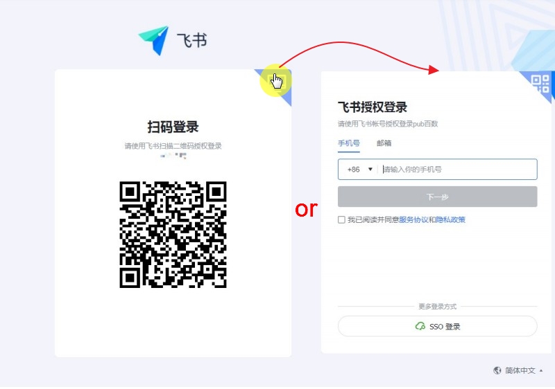打开企业URL,可以使用飞书扫码登录,或使用飞书账户密码登录。