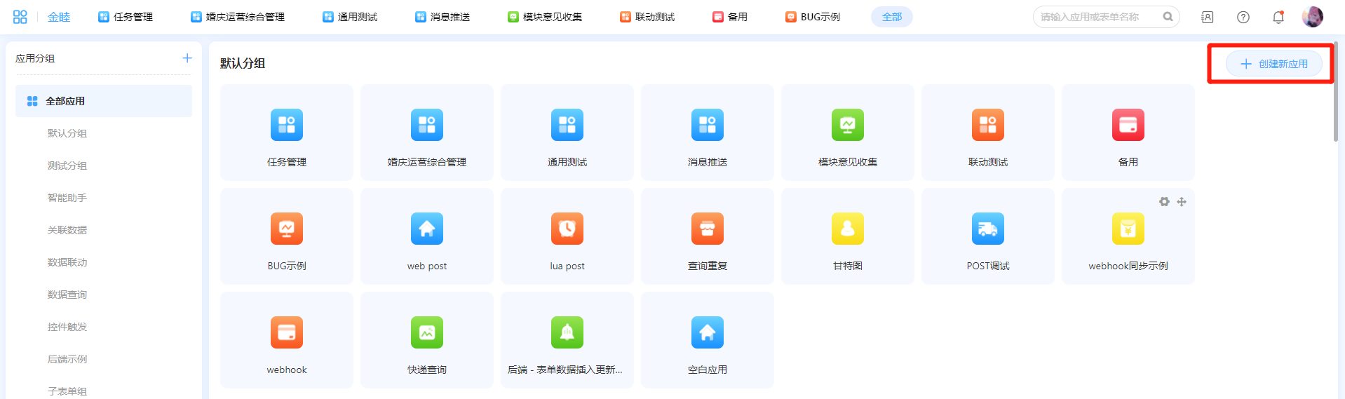 工作台入口:【登录系统】——【工作台】,在工作台页面,如果需要创建新应用,可以点击【创建新应用】。