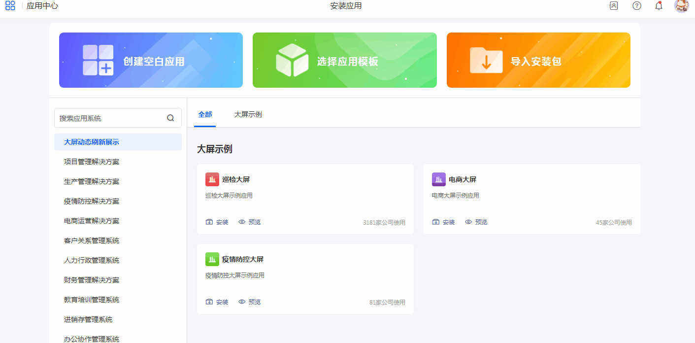 - 创建一个空白应用,自行设计;同时减轻用户自己设计应用的难度,我们还提供了各行各业的模板应用供参考。