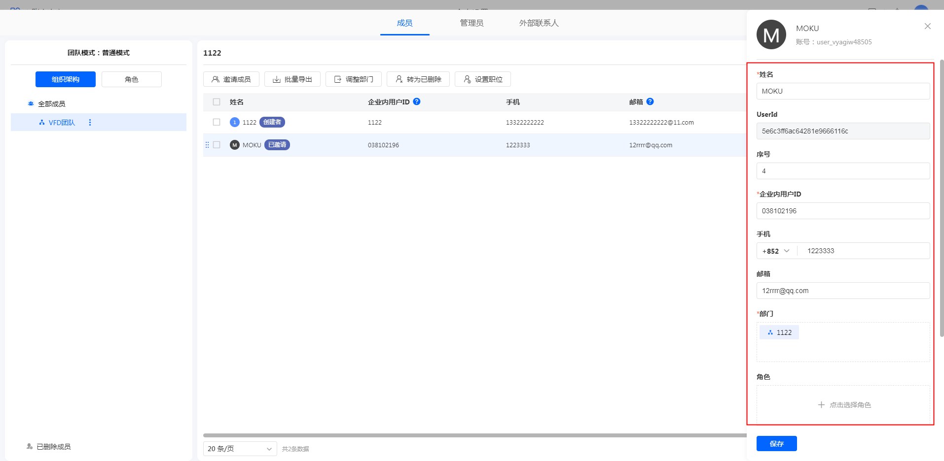 通讯录页面点击单条成员数据可以查看详情并进行姓名/企业ID/手机/邮箱/部门/角色/职位等信息的修改。