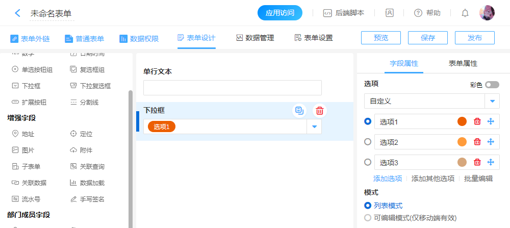 “下拉框”控件字段,可以修改转为“单选按钮组”或“单行文本”。