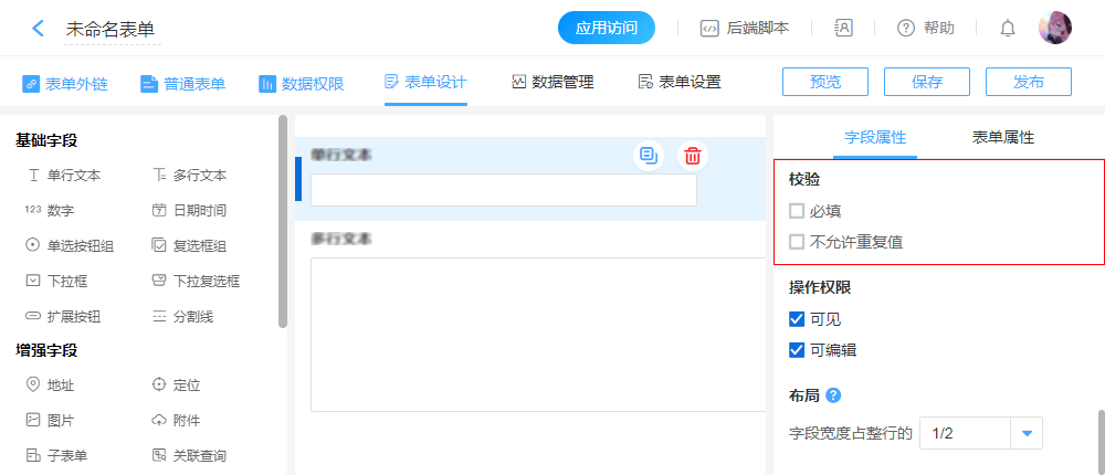 | 不允许重复值 | 勾选启用,填写表单时控件不允许输入重复值,控件内容重复时无法提交成功。 |