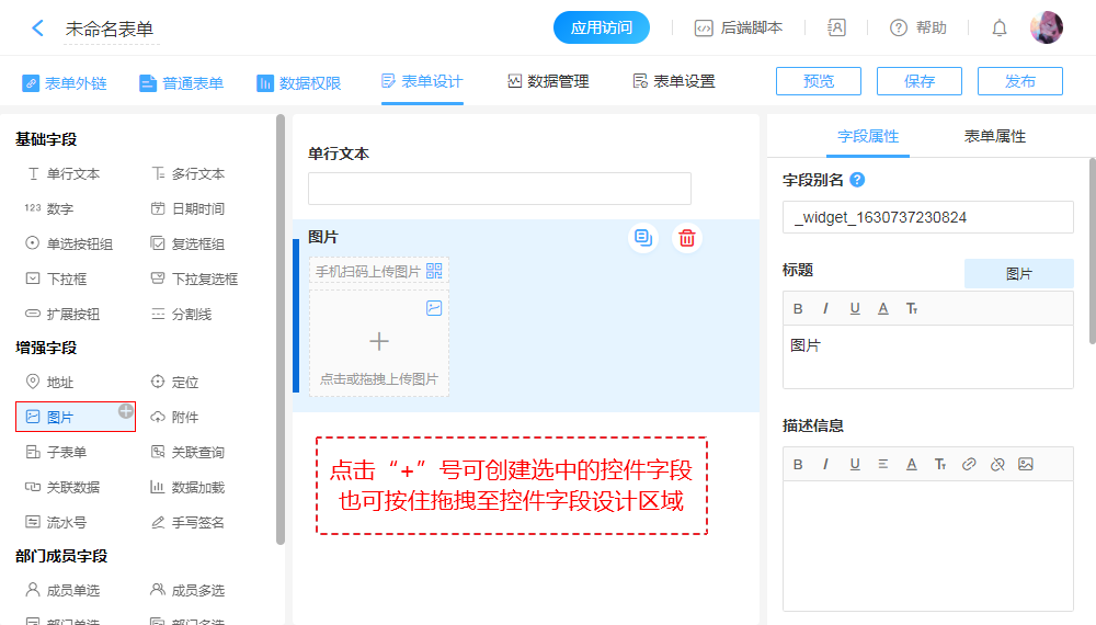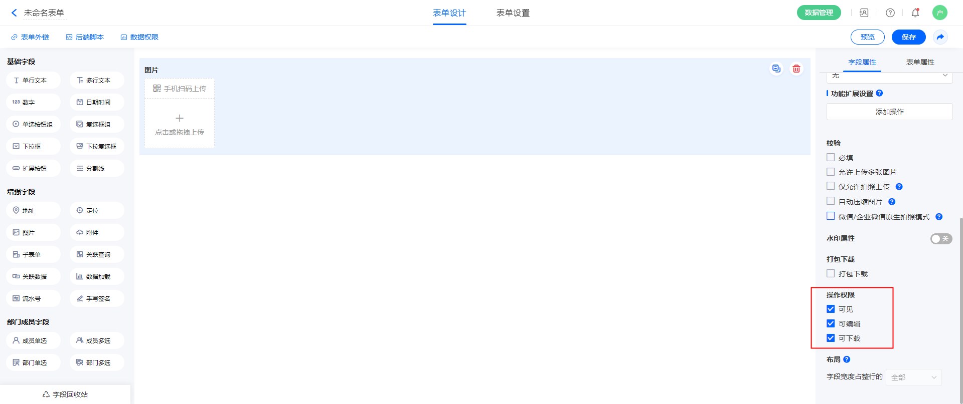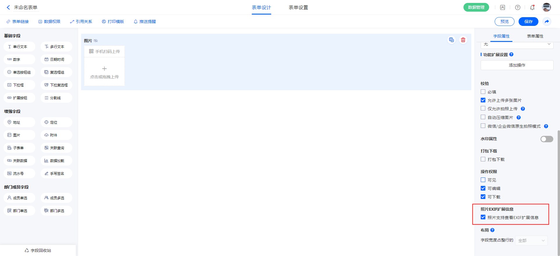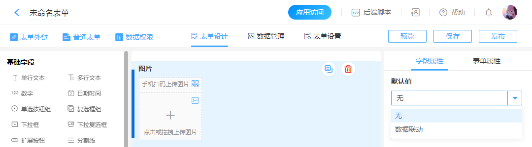 “图片”专门用于上传图片,同时带有压缩上传、仅允许拍照上传等功能。