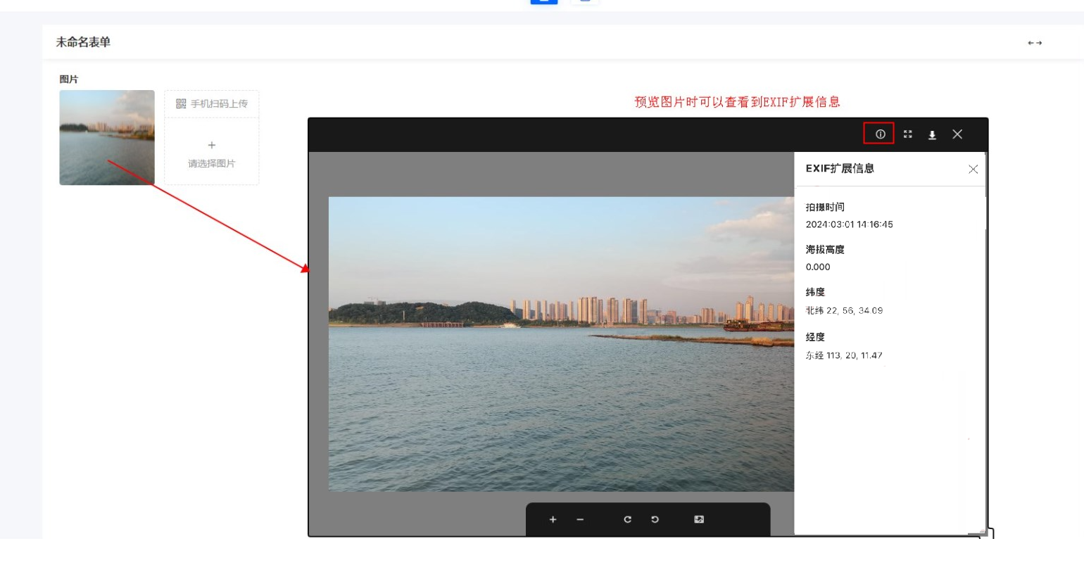 - 上传的图片本身带有EXIF扩展信息,系统预览图片时才会展示这些信息。