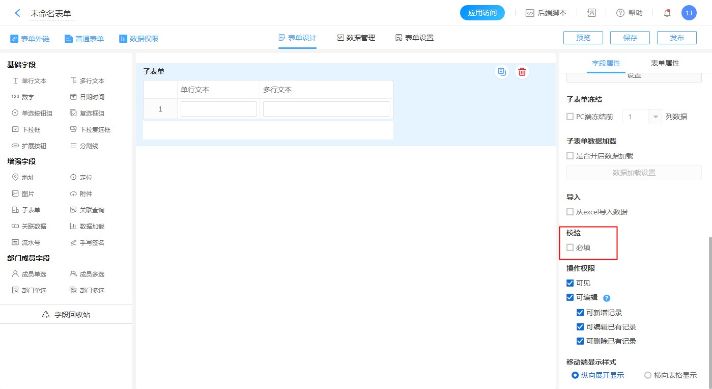 子字段的必填,不允许重复值,数字字段的数值范围等校验,和同类型普通字段的校验一致。