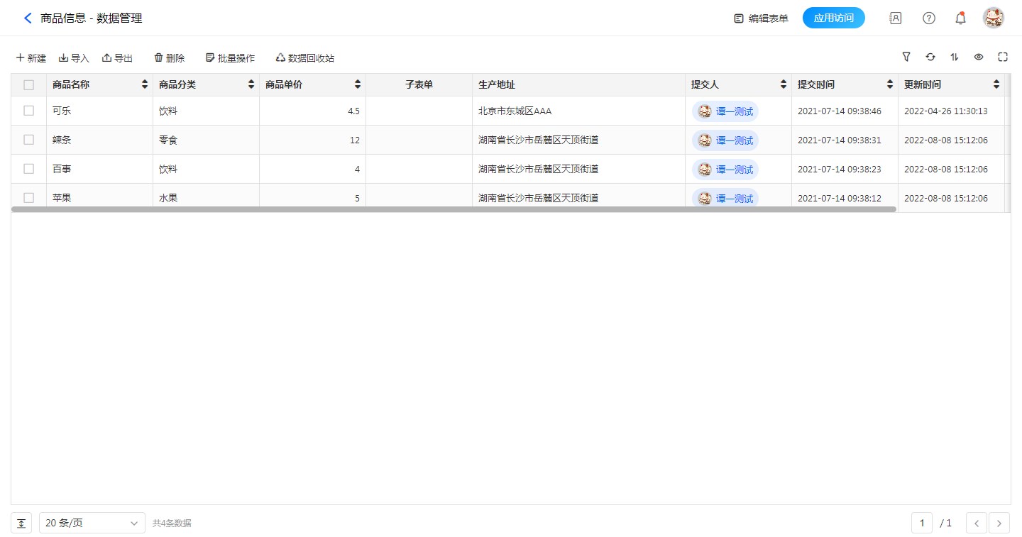 - 页面可以新增、删除、编辑、查看、导入、导出、批量操作、数据回收站、筛选条件,显示字段等所有功能。