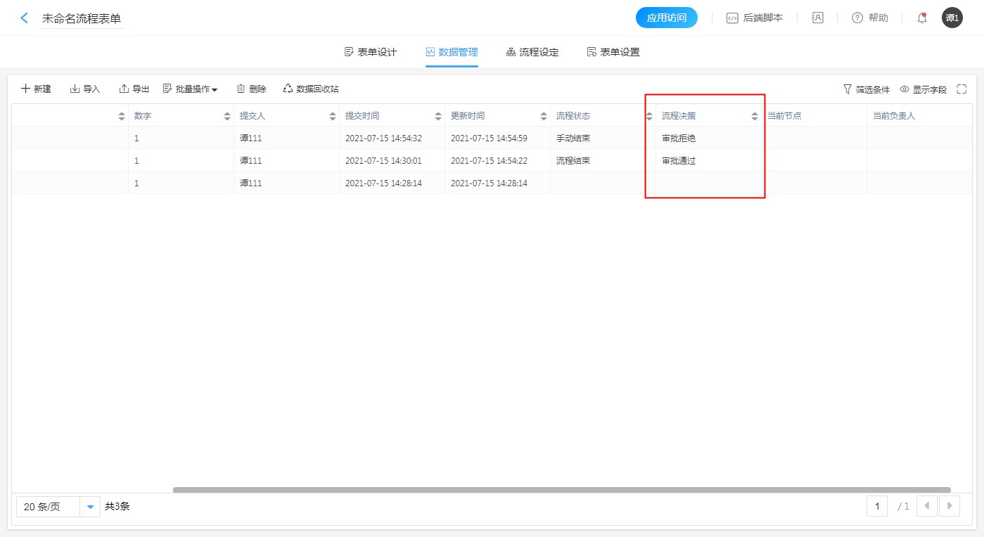 在流程属性中勾选了流程决策开关后,在后台数据管理管理员也可查看当前数据的流程决策。(审批通过或审批拒绝)