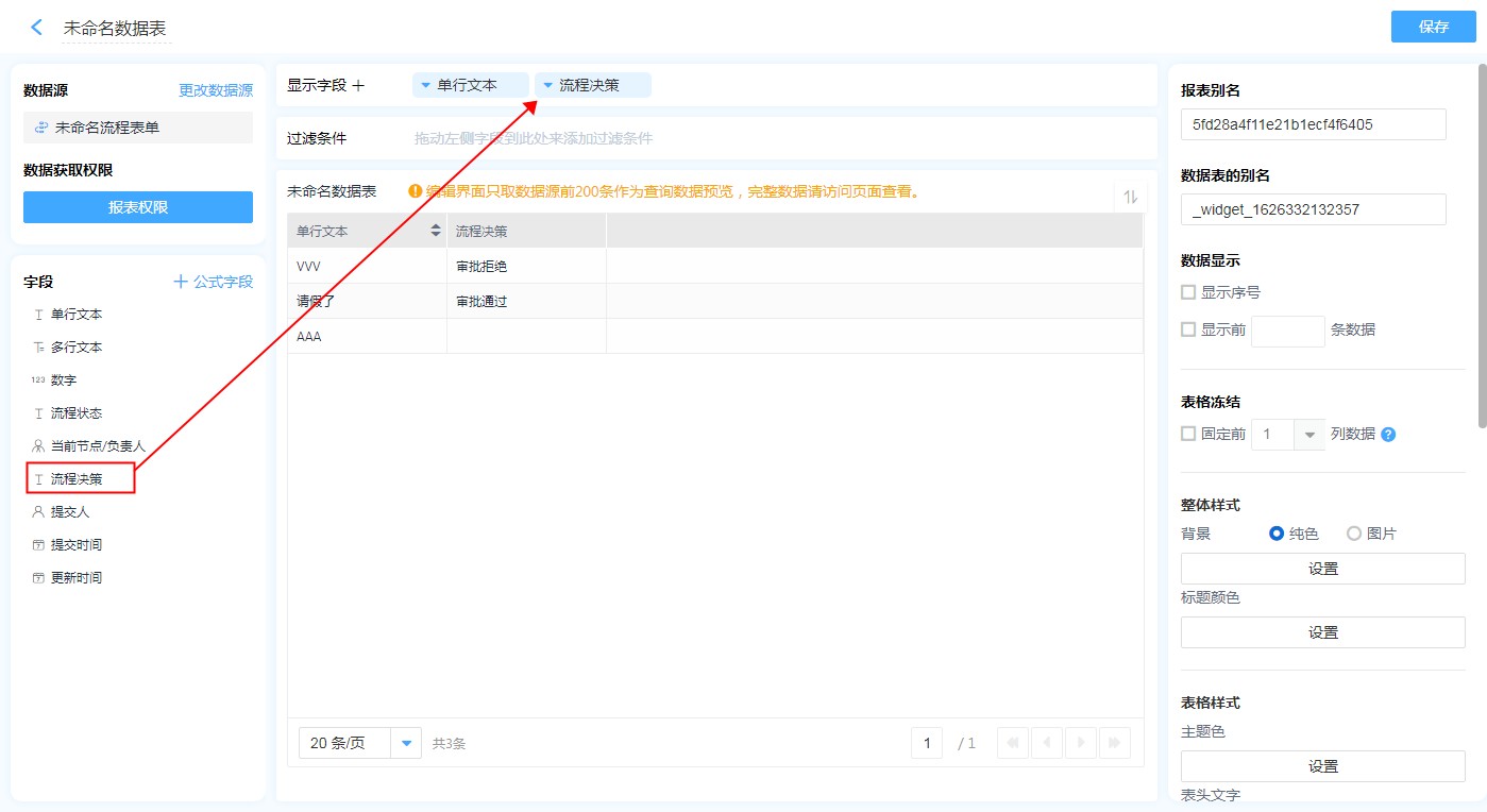在流程属性中勾选了流程决策开关,当以当前流程表为数据来源的报表中,可以添加【流程决策】这个字段在报表中展示。(报表中流程决策为审批通过和审批拒绝)
