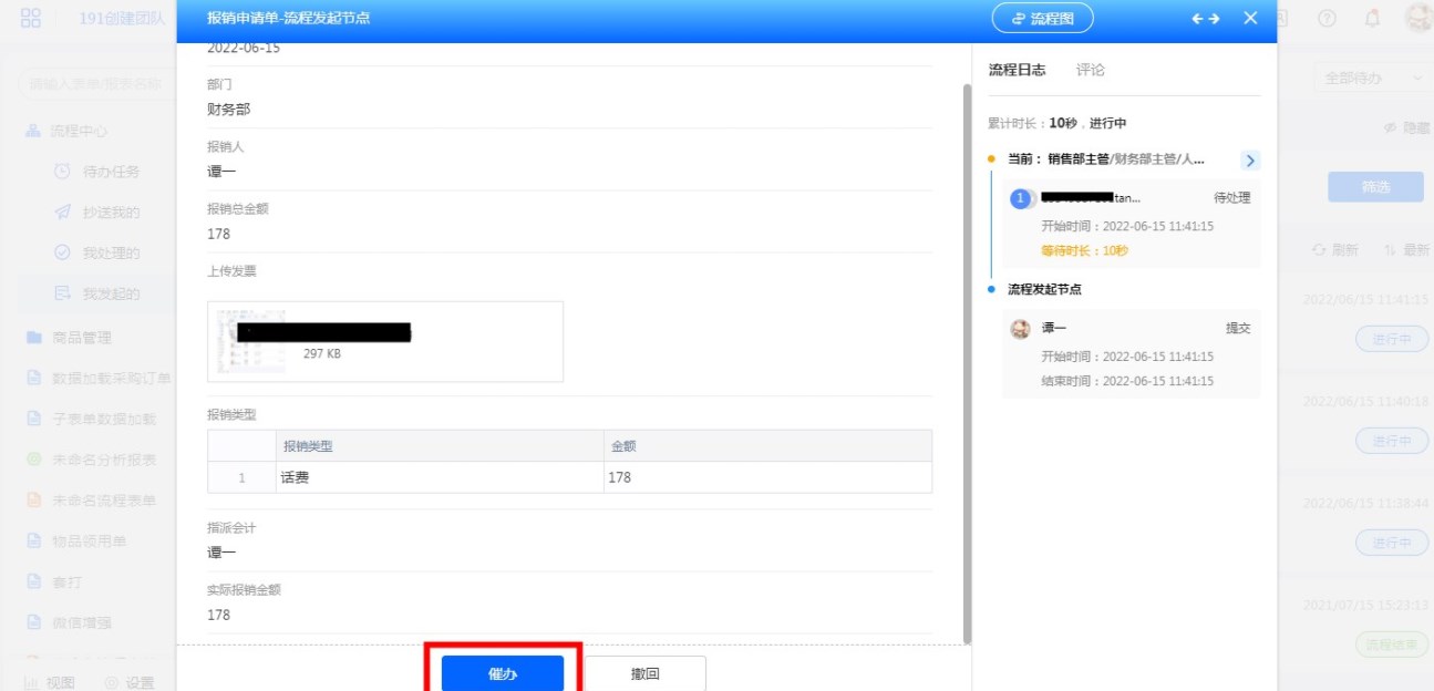 设置了以后,流程发起人即可在访问应用时在「我发起的」流程里找到需要催办的流程进行催办提醒。