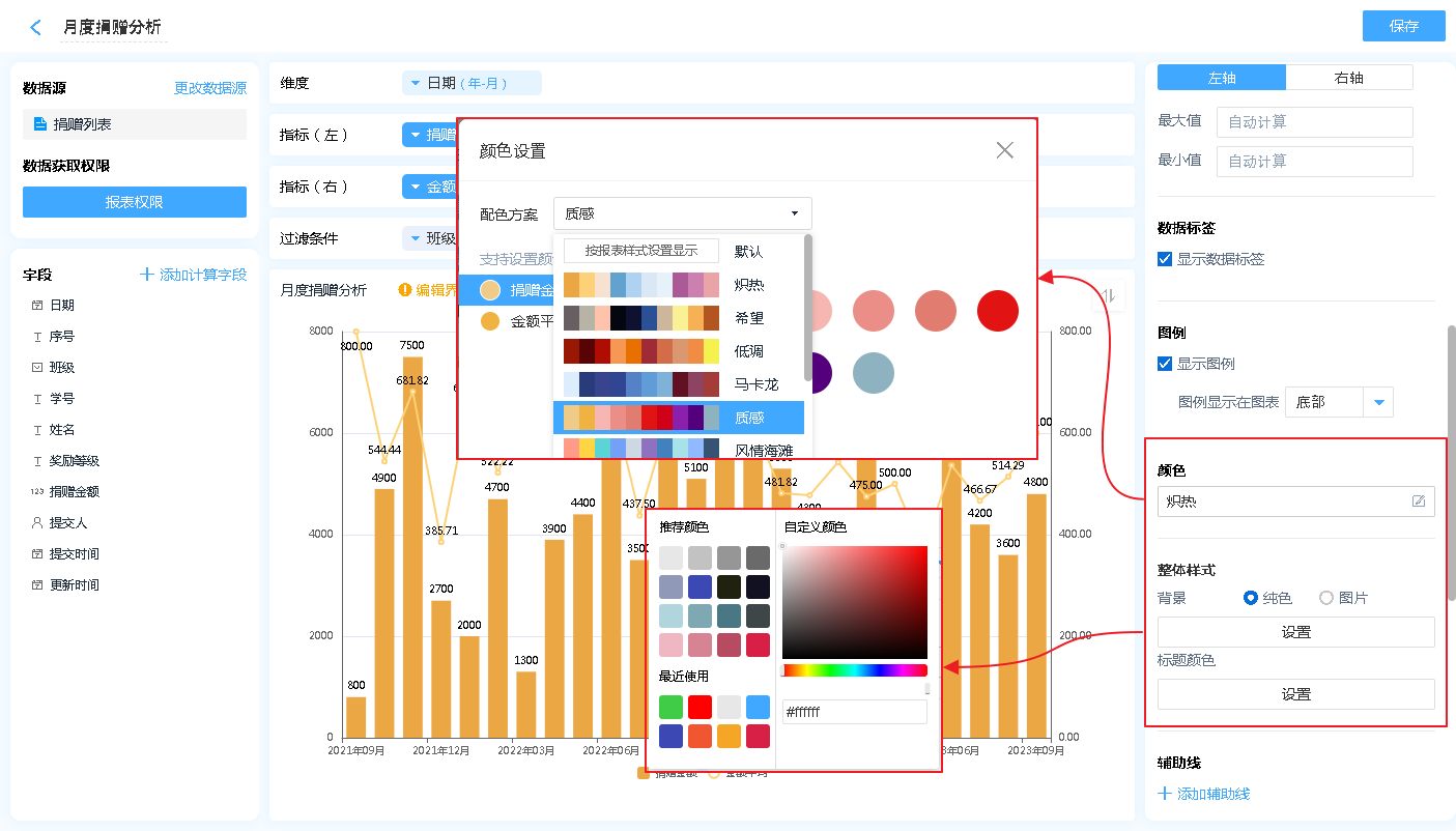 双轴图支持样式自定义,可自定义的包括:样式、颜色