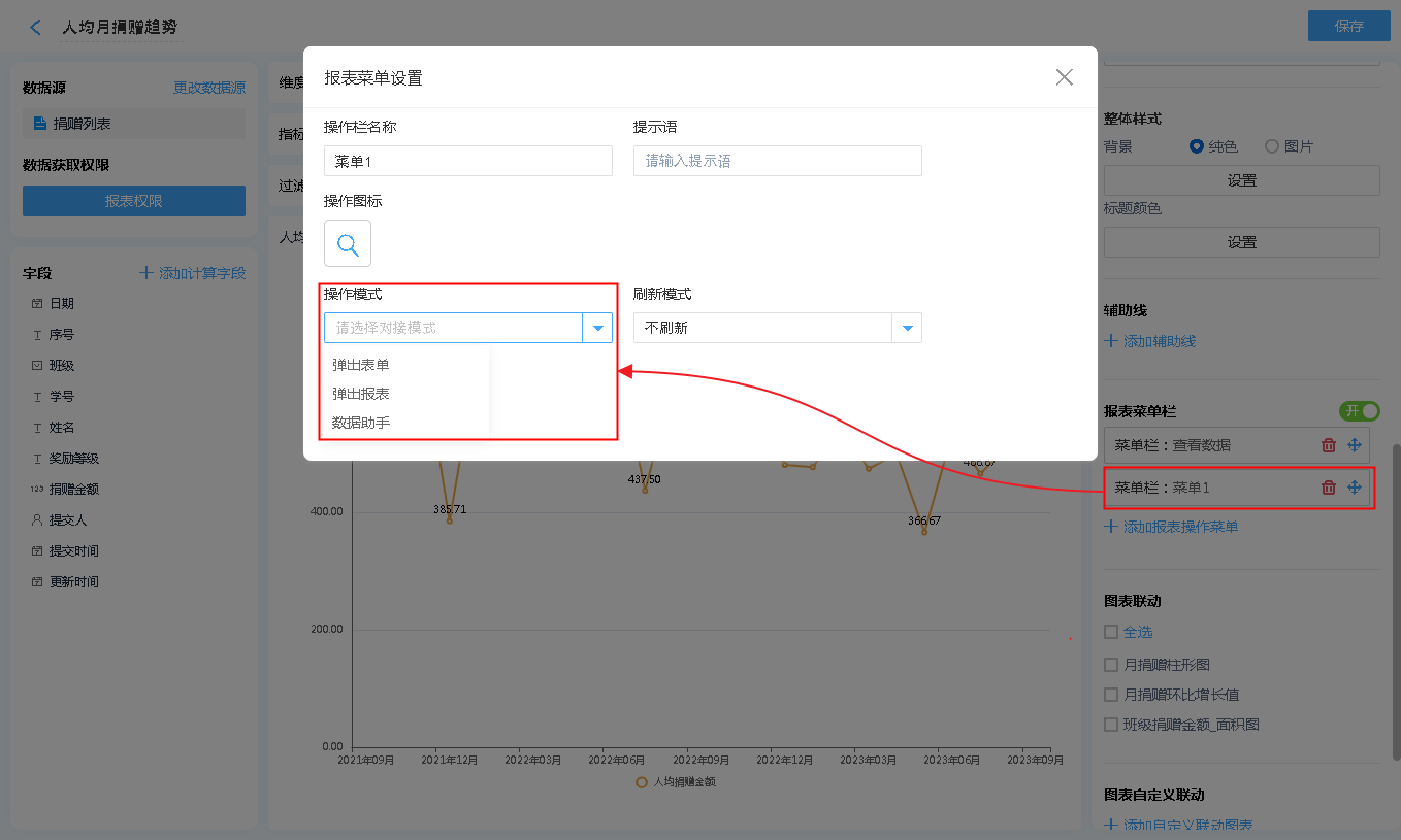 报表菜单 支持 弹出表单、弹出报表、数据助手