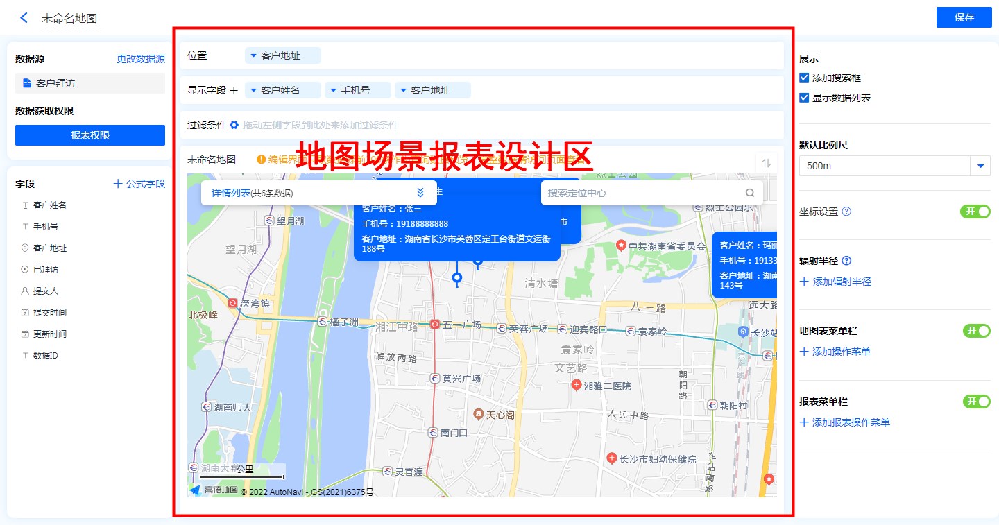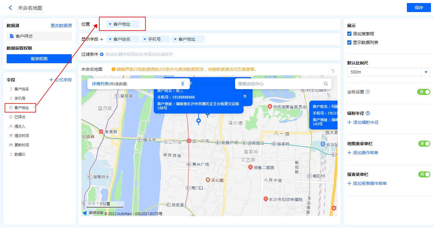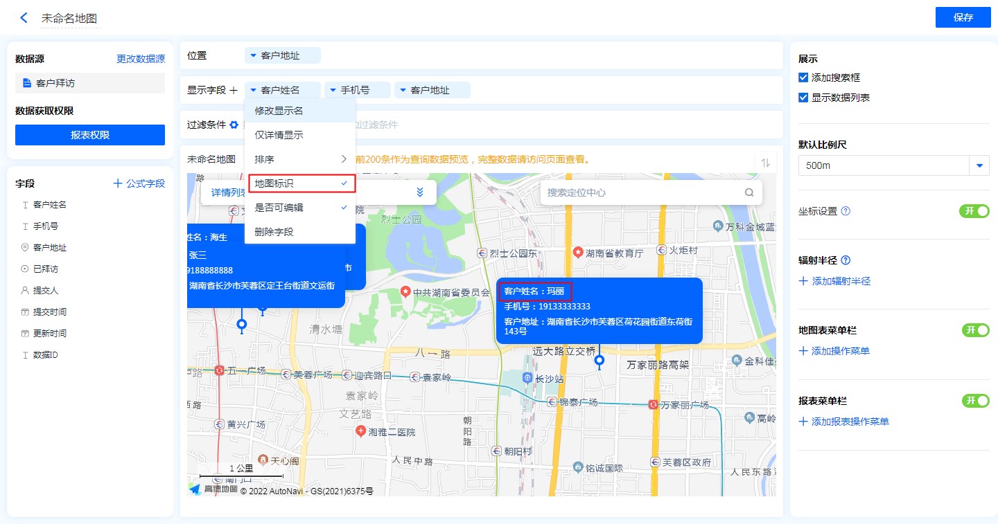 - 地图标识功能:显示字段勾选地图标识功能后,地图的位置标记处会显示该字段信息。