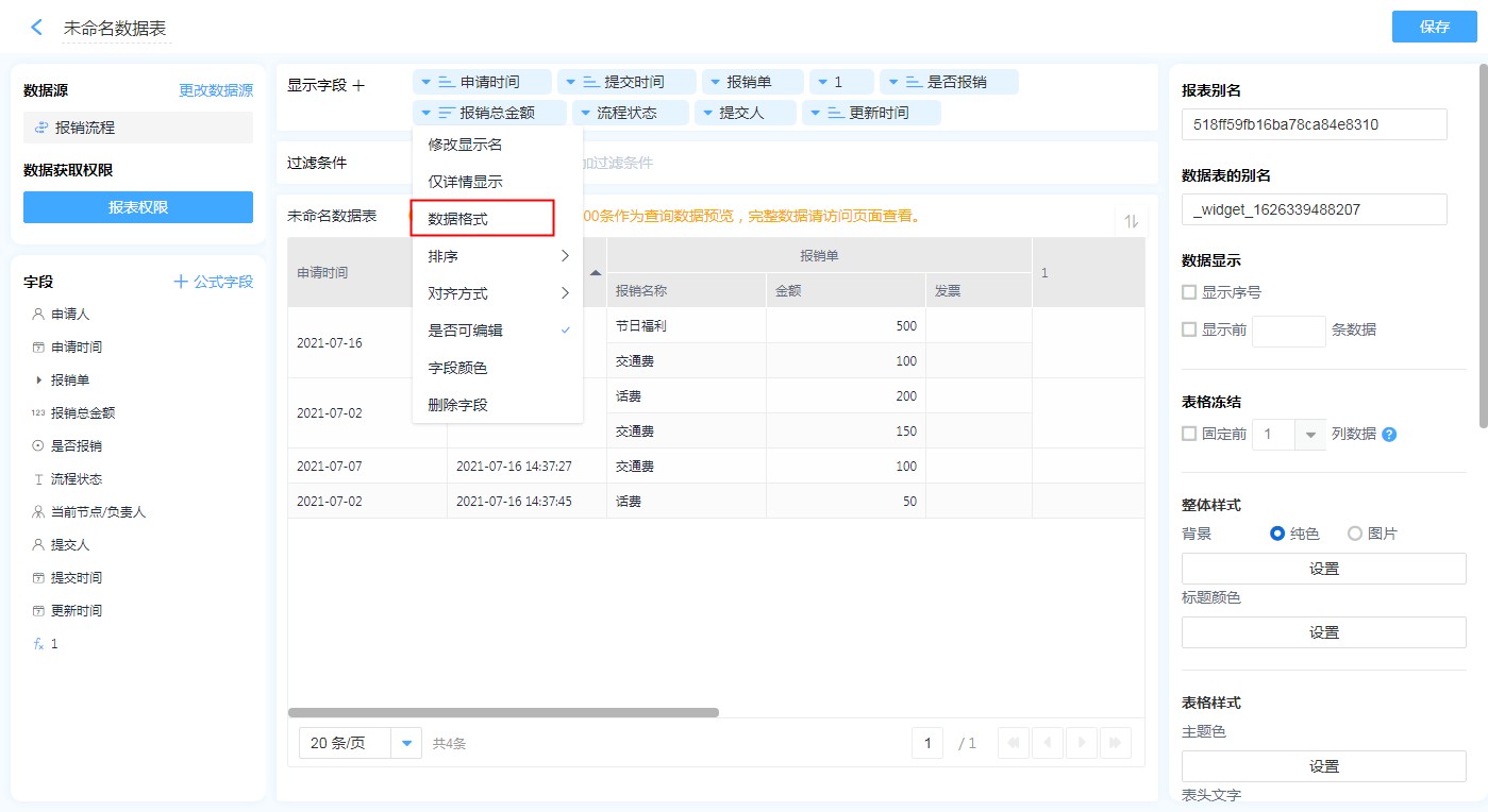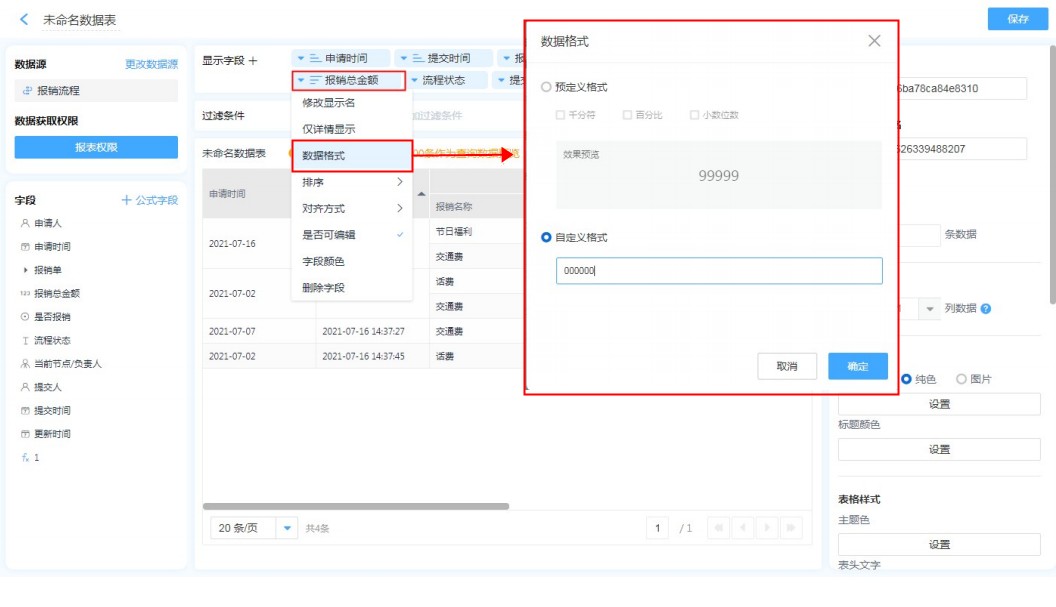 地址字段,日期字段,数字字段的格式设置很简单,只需要在报表中编辑字段,选择自己需要的格式即可。